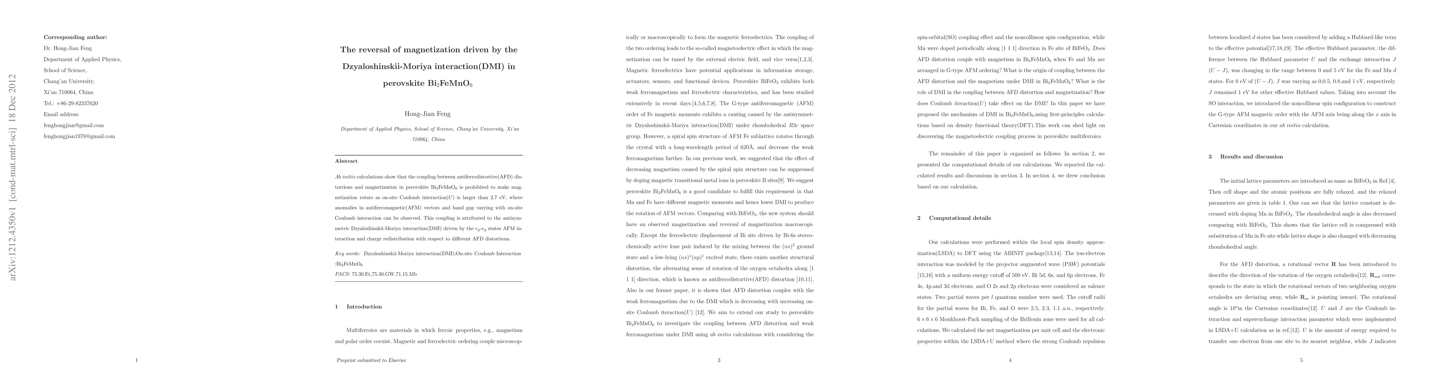 Summary: Ab initio calculations reveal that the Dzyaloshinskii-Moriya interaction (DMI) drives magnetization reversal in perovskite Bi2FeMnO6, with the coupling between antiferrodistortive distortions and magnetization being significant due to the eg-eg states AFM interaction and charge redistribution, despite high on-site Coulomb interaction.