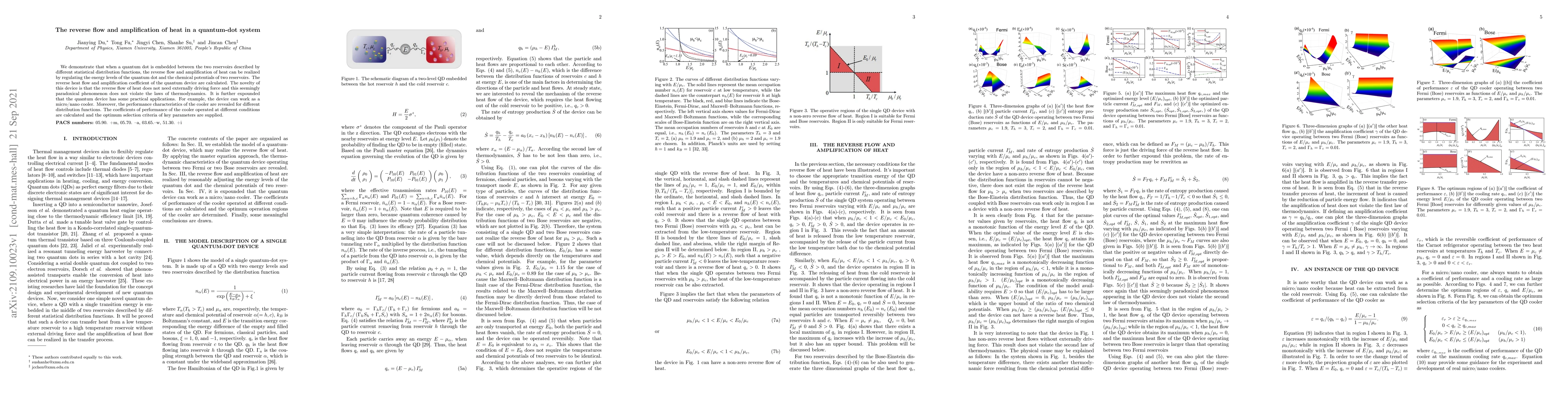 We demonstrate that when a quantum dot is embedded between the two reservoirs described by different statistical distribution functions, the reverse flow and amplification of heat can be realized by regulating the energy levels of the quantum dot and the chemical potentials of two reservoirs. The reverse heat flow and amplification coefficient of the quantum device are calculated. The novelty of this device is that the reverse flow of heat does not need externally driving force and this seemingly paradoxical phenomenon does not violate the laws of thermodynamics. It is further expounded that the quantum device has some practical applications. For example, the device can work as a micro/nano cooler. Moreover, the performance characteristics of the cooler are revealed for different distribution functions. The coefficients of performance of the cooler operated at different conditions are calculated and the optimum selection criteria of key parameters are supplied.