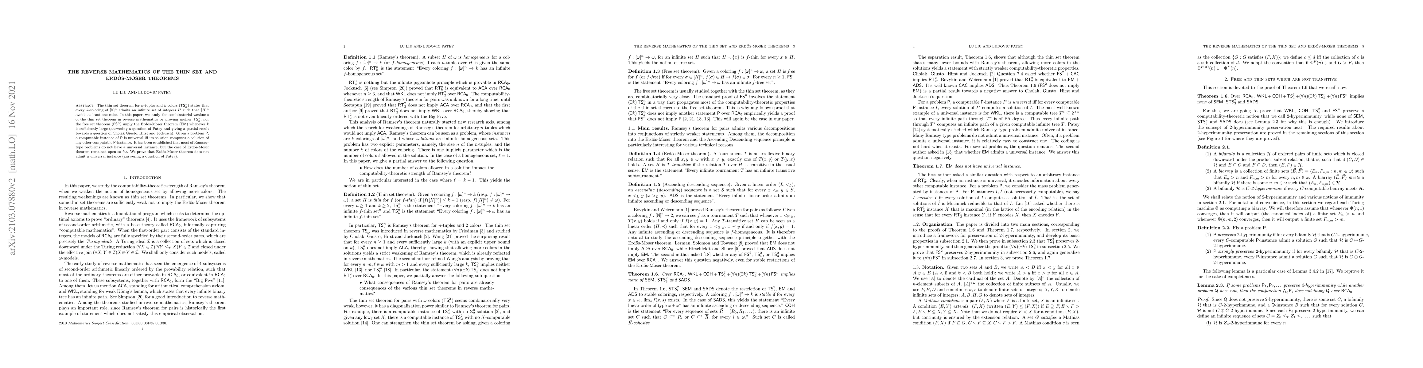 This paper investigates the reverse mathematics of the thin set theorem and the free set theorem, showing they do not imply the Erdős-Moser theorem for sufficiently large $k$. It also proves that the Erdős-Moser theorem does not have a universal computable instance.