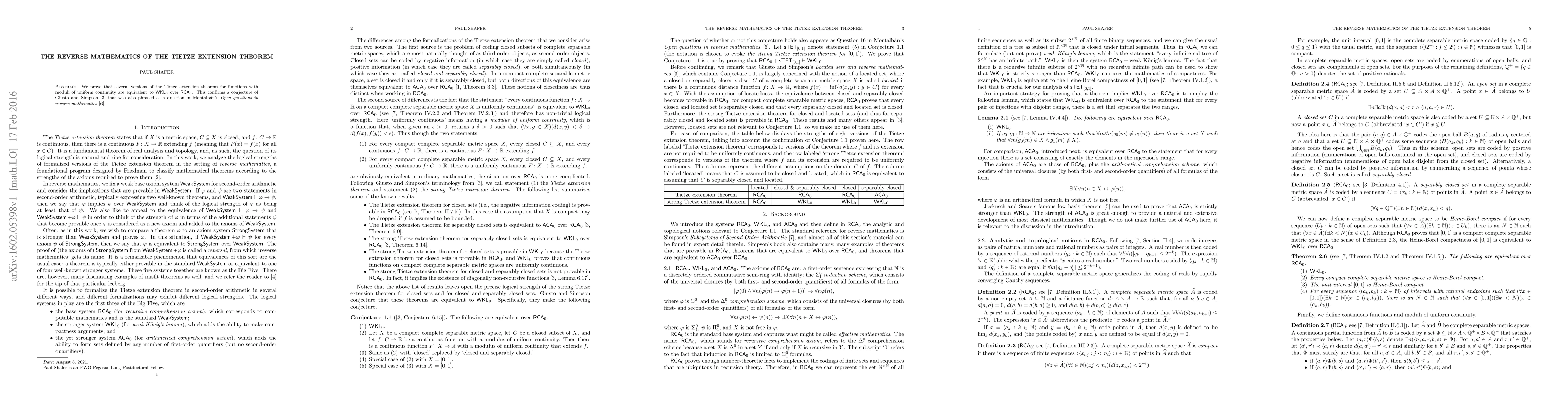 Summary: The paper demonstrates that various forms of the Tietze extension theorem, involving uniform continuity moduli, are equivalent to WKL_0 over RCA_0, confirming a conjecture by Giusto and Simpson and addressing a question in Montalbán's compilation of open questions in reverse mathematics.