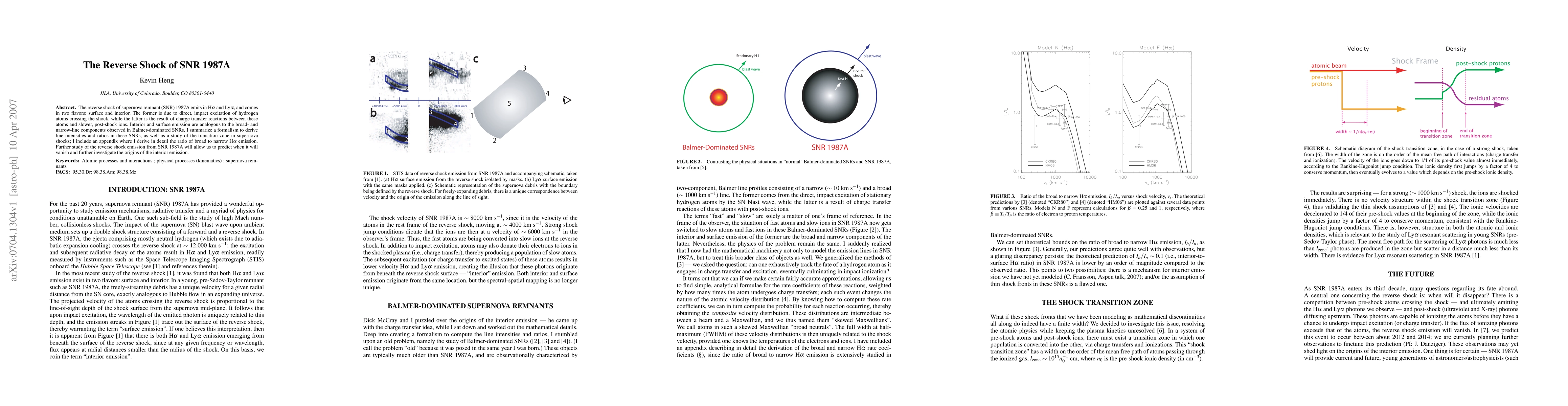 The reverse shock of supernova remnant (SNR) 1987A emits in H-alpha and Ly-alpha, and comes in two flavors: surface and interior. The former is due to direct, impact excitation of hydrogen atoms crossing the shock, while the latter is the result of charge transfer reactions between these atoms and slower, post-shock ions. Interior and surface emission are analogous to the broad- and narrow-line components observed in Balmer-dominated SNRs. I summarize a formalism to derive line intensities and ratios in these SNRs, as well as a study of the transition zone in supernova shocks; I include an appendix where I derive in detail the ratio of broad to narrow H-alpha emission. Further study of the reverse shock emission from SNR 1987A will allow us to predict when it will vanish and further investigate the origins of the interior emission.