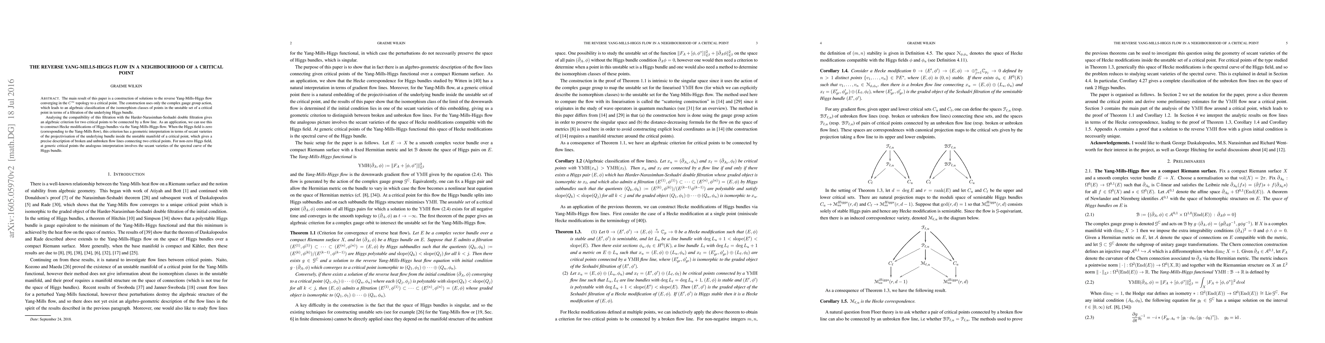 The main result of this paper is a construction of solutions to the reverse Yang-Mills-Higgs flow converging in the $C^\infty$ topology to a critical point. The construction uses only the complex gauge group action, which leads to an algebraic classification of the isomorphism classes of points in the unstable set of a critical point in terms of a filtration of the underlying Higgs bundle. Analysing the compatibility of this filtration with the Harder-Narasimhan-Seshadri double filtration gives an algebraic criterion for two critical points to be connected by a flow line. As an application, we can use this to construct Hecke modifications of Higgs bundles via the Yang-Mills-Higgs flow. When the Higgs field is zero (corresponding to the Yang-Mills flow), this criterion has a geometric interpretation in terms of secant varieties of the projectivisation of the underlying bundle inside the unstable manifold of a critical point, which gives a precise description of broken and unbroken flow lines connecting two critical points. For non-zero Higgs field, at generic critical points the analogous interpretation involves the secant varieties of the spectral curve of the Higgs bundle.