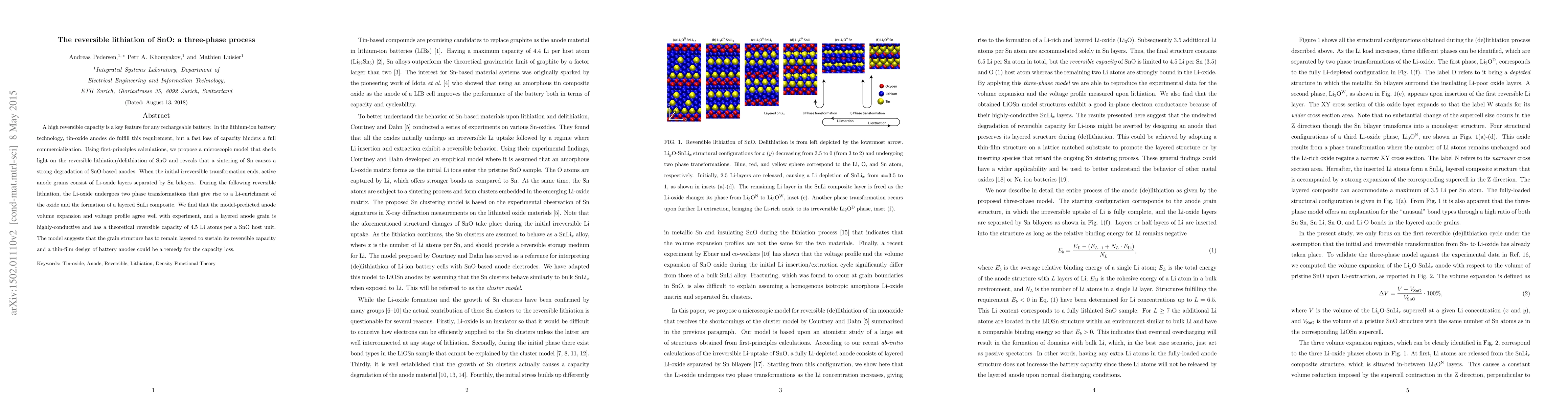 This paper proposes a microscopic model explaining the reversible lithiation of SnO in lithium-ion batteries, revealing a three-phase process involving Li-oxide layers and Sn bilayers. The model predicts a high reversible capacity and suggests that maintaining a layered grain structure in thin-film designs could mitigate capacity loss.