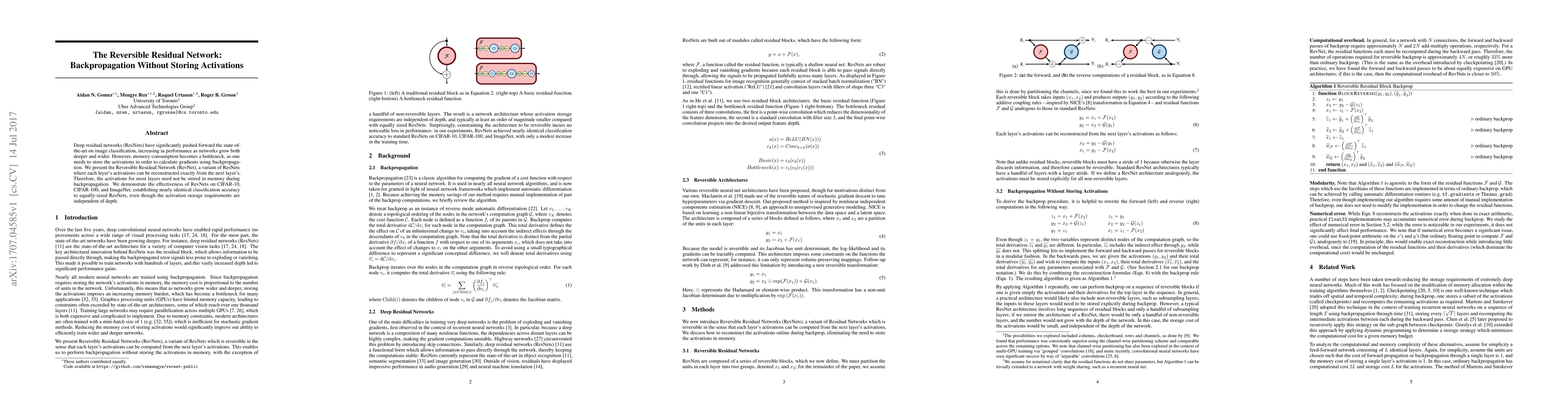 Deep residual networks (ResNets) have significantly pushed forward the state-of-the-art on image classification, increasing in performance as networks grow both deeper and wider. However, memory consumption becomes a bottleneck, as one needs to store the activations in order to calculate gradients using backpropagation. We present the Reversible Residual Network (RevNet), a variant of ResNets where each layer's activations can be reconstructed exactly from the next layer's. Therefore, the activations for most layers need not be stored in memory during backpropagation. We demonstrate the effectiveness of RevNets on CIFAR-10, CIFAR-100, and ImageNet, establishing nearly identical classification accuracy to equally-sized ResNets, even though the activation storage requirements are independent of depth.