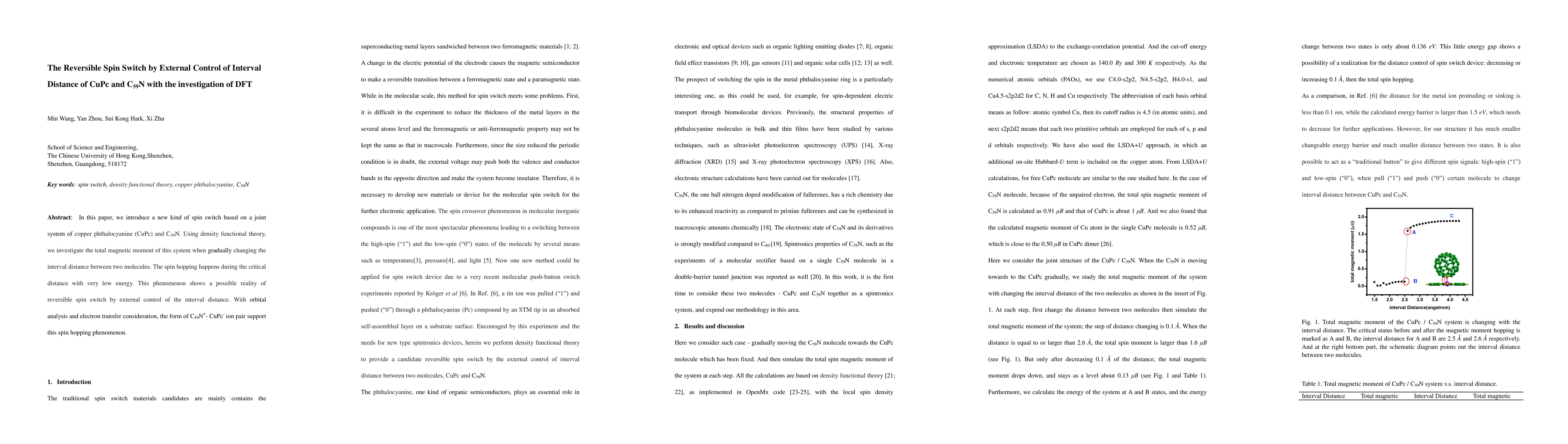 This paper explores a reversible spin switch in a CuPc and C59N joint system, demonstrating spin hopping at a critical distance with low energy using density functional theory. The C59N+-CuPc- ion pair supports this phenomenon, indicating potential for external control of spin states.