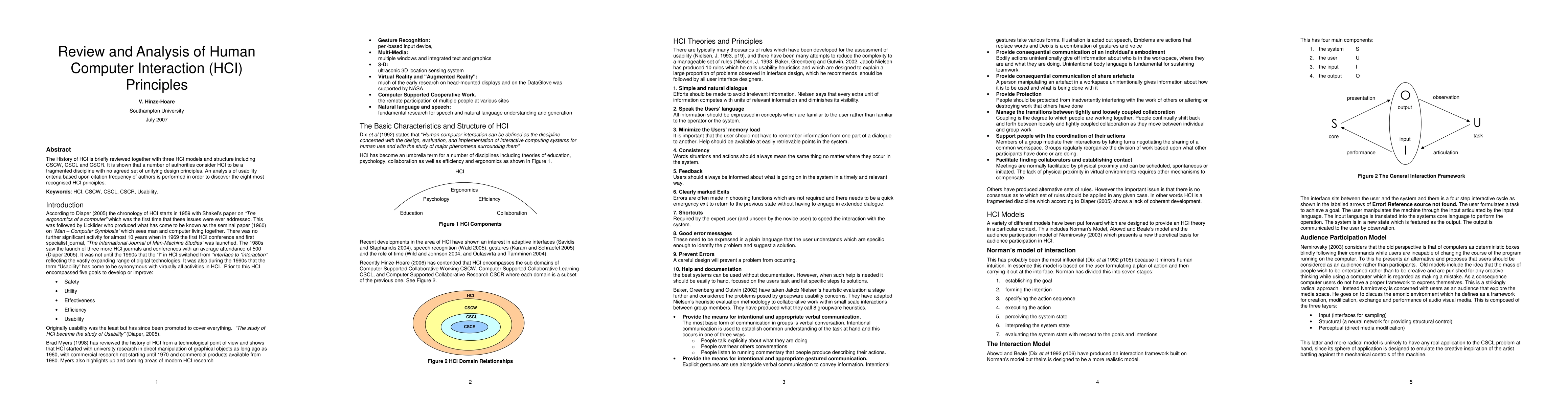 The History of HCI is briefly reviewed together with three HCI models and structure including CSCW, CSCL and CSCR. It is shown that a number of authorities consider HCI to be a fragmented discipline with no agreed set of unifying design principles. An analysis of usability criteria based upon citation frequency of authors is performed in order to discover the eight most recognised HCI principles.