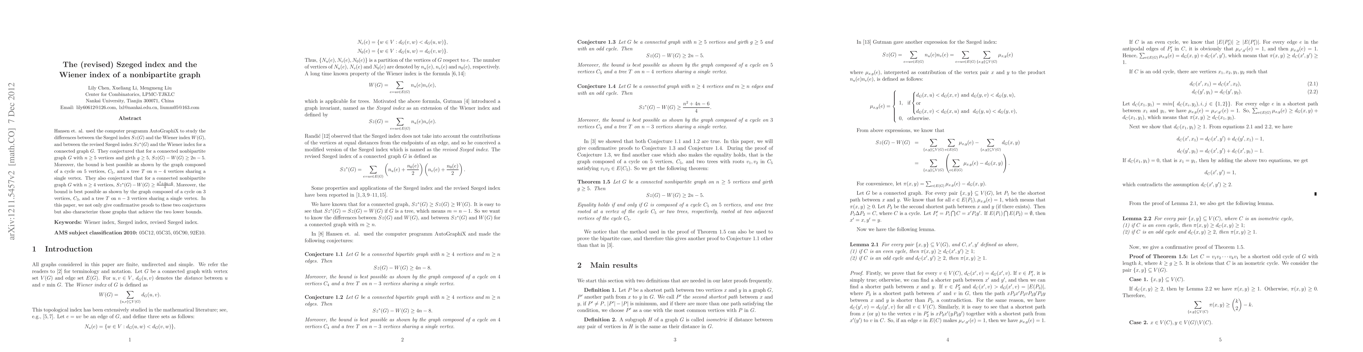 This paper confirms two conjectures regarding the differences between the Szeged index, the revised Szeged index, and the Wiener index in connected nonbipartite graphs. It provides proofs and identifies the specific graph structures that achieve the proposed lower bounds.