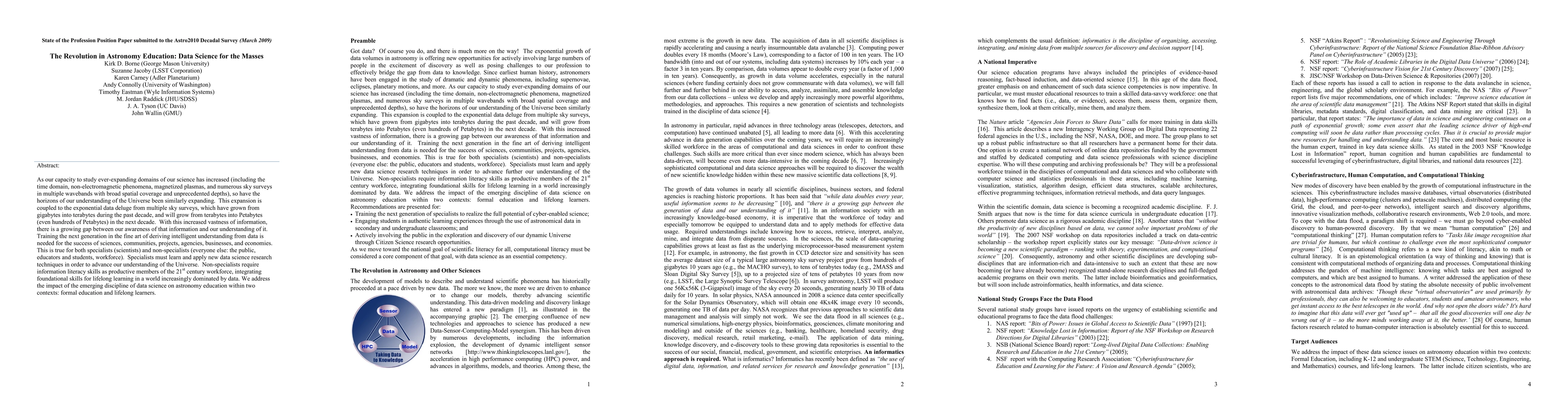 As our capacity to study ever-expanding domains of our science has increased (including the time domain, non-electromagnetic phenomena, magnetized plasmas, and numerous sky surveys in multiple wavebands with broad spatial coverage and unprecedented depths), so have the horizons of our understanding of the Universe been similarly expanding. This expansion is coupled to the exponential data deluge from multiple sky surveys, which have grown from gigabytes into terabytes during the past decade, and will grow from terabytes into Petabytes (even hundreds of Petabytes) in the next decade. With this increased vastness of information, there is a growing gap between our awareness of that information and our understanding of it. Training the next generation in the fine art of deriving intelligent understanding from data is needed for the success of sciences, communities, projects, agencies, businesses, and economies. This is true for both specialists (scientists) and non-specialists (everyone else: the public, educators and students, workforce). Specialists must learn and apply new data science research techniques in order to advance our understanding of the Universe. Non-specialists require information literacy skills as productive members of the 21st century workforce, integrating foundational skills for lifelong learning in a world increasingly dominated by data. We address the impact of the emerging discipline of data science on astronomy education within two contexts: formal education and lifelong learners.