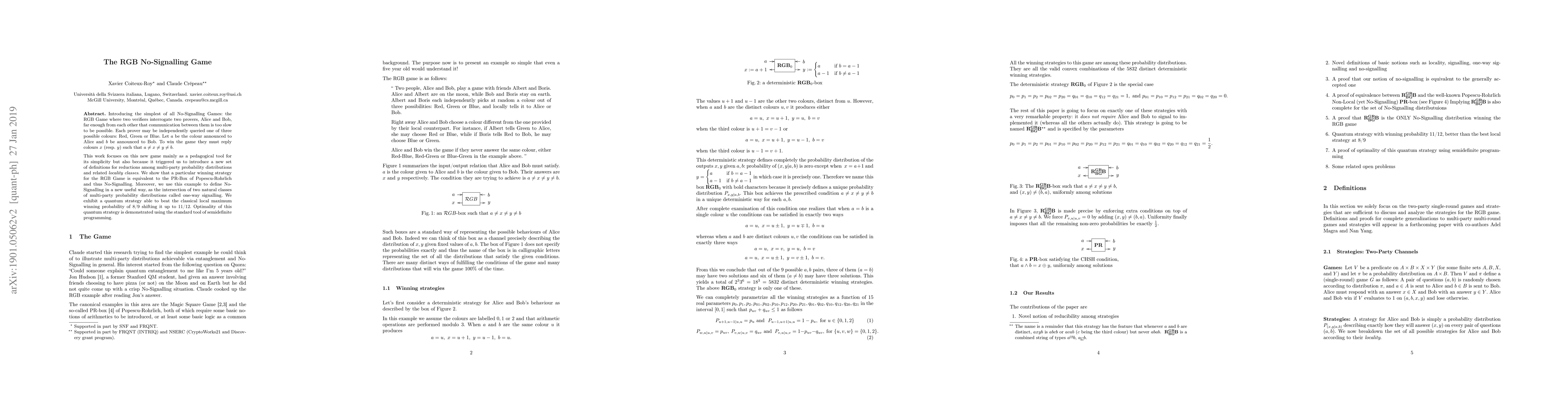 The RGB No-Signalling Game involves two provers, Alice and Bob, interrogated independently with three colors, aiming to reply in ways that avoid signalling. This game introduces new definitions for reductions among multi-party probability distributions and demonstrates a quantum strategy that surpasses the classical winning probability, using semidefinite programming to prove optimality.