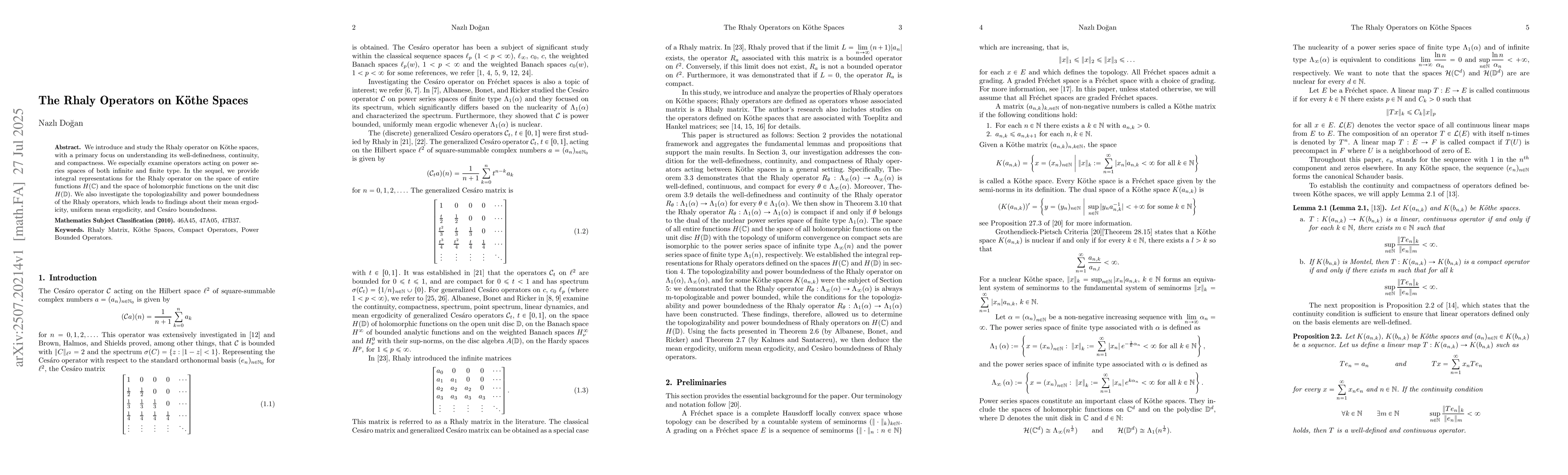 We introduce and study the Rhaly operator on K\"othe spaces, with a primary focus on understanding its well-definedness, continuity, and compactness. We especially examine operators acting on power series spaces of both infinite and finite type. In the sequel, we provide integral representations for the Rhaly operator on the space of entire functions $H(\mathbb{C})$ and the space of holomorphic functions on the unit disc $H(\mathbb{D})$. We also investigate the topologizability and power boundedness of the Rhaly operators, which leads to findings about their mean ergodicity, uniform mean ergodicity, and Ces\`aro boundedness.