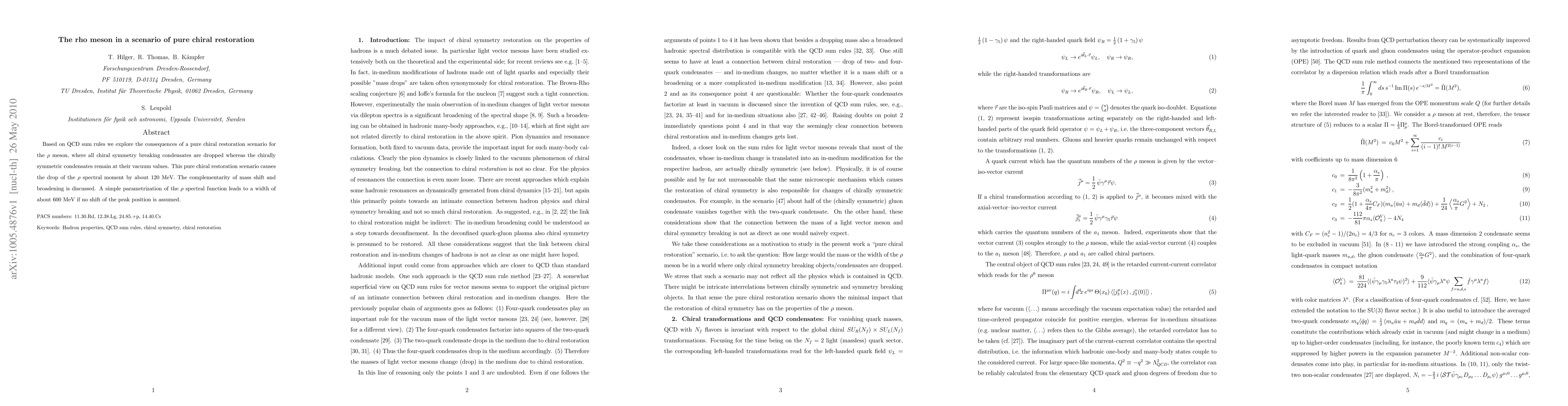 Based on QCD sum rules we explore the consequences of a pure chiral restoration scenario for the rho meson, where all chiral symmetry breaking condensates are dropped whereas the chirally symmetric condensates remain at their vacuum values. This pure chiral restoration scenario causes the drop of the rho spectral moment by about 120 MeV. The complementarity of mass shift and broadening is discussed. A simple parametrization of the rho spectral function leads to a width of about 600 MeV if no shift of the peak position is assumed.