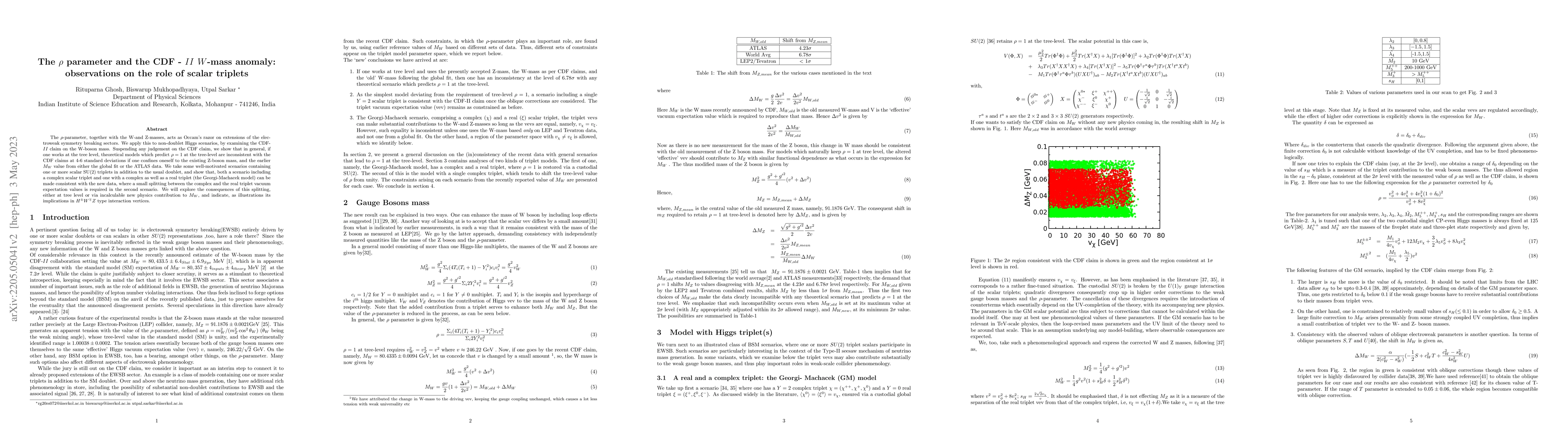 This paper investigates the consistency of theoretical models predicting $\rho = 1$ with the CDF II W-boson mass anomaly, finding that models with scalar SU(2) triplets can reconcile the anomaly with the new data, requiring a small splitting between the complex and real triplet vacuum expectation values. The study highlights the implications of this splitting in $H^{\pm}W^{\mp}Z$ interaction vertices.
