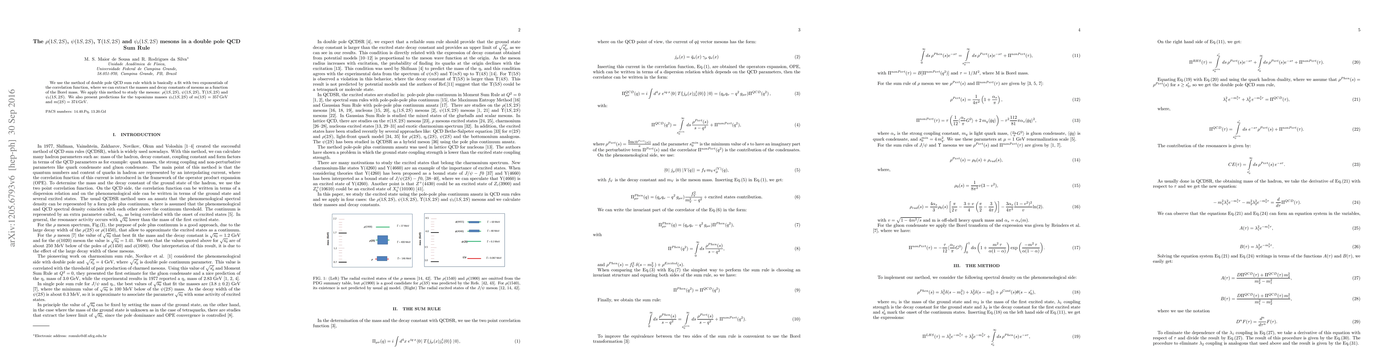 We use the method of double pole QCD sum rule which is basically a fit with two exponentials of the correlation function, where we can extract the masses and decay constants of mesons as a function of the Borel mass. We apply this method to study the mesons: $\rho(1S,2S)$, $\psi(1S,2S)$, $\Upsilon(1S,2S)$ and $\psi_t(1S,2S)$. We also present predictions for the toponiuns masses $\psi_t(1S,2S)$ of m(1S)=357 GeV and m(2S)=374 GeV.