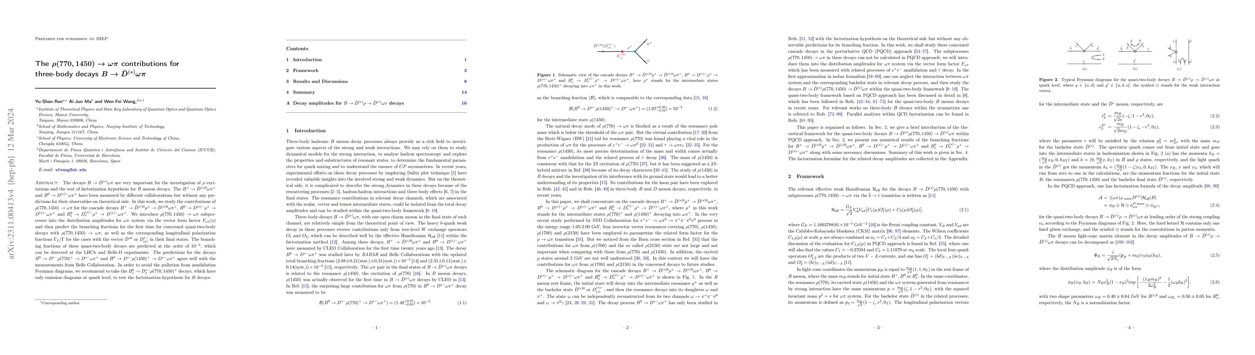 The decays $B\to\bar{D}^{(*)} \omega\pi$ are very important for the investigation of $\rho$ excitations and the test of factorization hypothesis for $B$ meson decays. The $B^{+}\to \bar{D}^{(*)0}\omega\pi^+$ and $B^{0}\to D^{(*)-}\omega\pi^+$ have been measured by different collaborations but without any predictions for their observables on theoretical side. In this work, we study the contributions of $\rho(770,1450)\to \omega\pi$ for the cascade decays $B^{+}\to \bar{D}^{(*)0} \rho^+ \to \bar{D}^{(*)0}\omega\pi^+$, $B^{0}\to D^{(*)-} \rho^+ \to D^{(*)-}\omega\pi^+$ and $B_s^{0}\to D_s^{(*)-} \rho^+ \to D^{(*)-}\omega\pi^+$. We introduce $\rho(770,1450)\to \omega\pi$ subprocesses into the distribution amplitudes for $\omega\pi$ system via the vector form factor $F_{\omega\pi}(s)$ and then predict the branching fractions for the first time for concerned quasi-two-body decays with $\rho(770,1450)\to \omega\pi$, as well as the corresponding longitudinal polarization fractions $\Gamma_L/\Gamma$ for the cases with the vector $\bar{D}^{*0}$ or $D_{(s)}^{*-}$ in their final states. The branching fractions of these quasi-two-body decays are predicted at the order of $10^{-3}$, which can be detected at the LHCb and Belle-II experiments. The predictions for the decays ${B}^0 \to{D}^{*-} \rho(770)^+\to {D}^{*-} \omega\pi^+$ and ${B}^0 \to {D}^{*-} \rho(1450)^+\to {D}^{*-} \omega\pi^+$ agree well with the measurements from Belle Collaboration. In order to avoid the pollution from annihilation Feynman diagrams, we recommend to take the $B_s^0 \to D_s^{*-}\rho(770,1450)^+$ decays, which have only emission diagrams at quark level, to test the factorization hypothesis for $B$ decays.