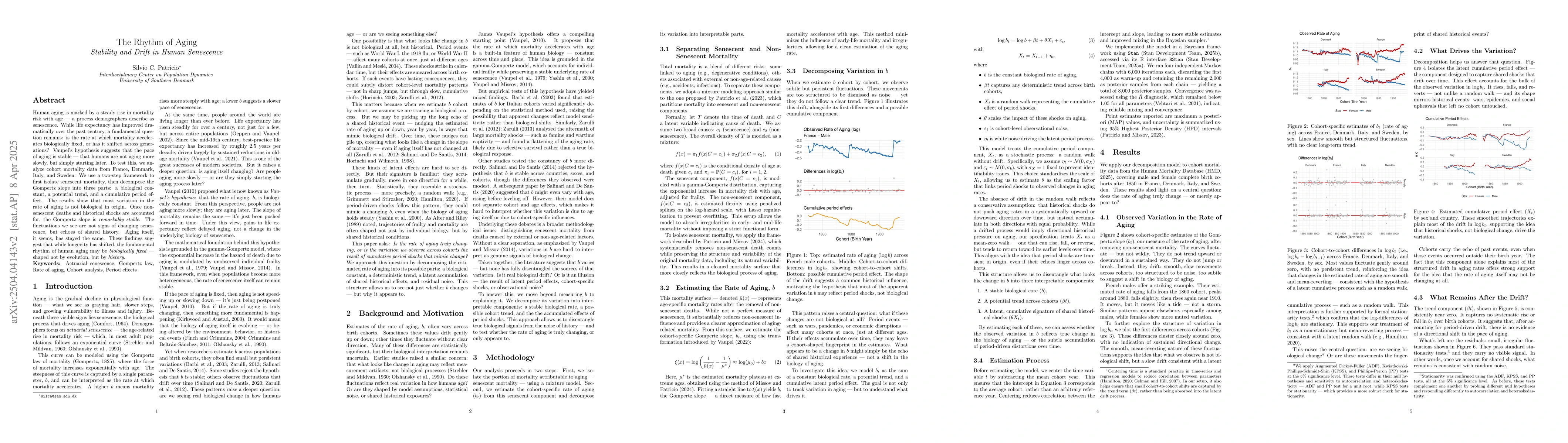 Human aging is marked by a steady rise in mortality risk with age - a process demographers describe as senescence. While life expectancy has improved dramatically over the past century, a fundamental question remains: is the rate at which mortality accelerates biologically fixed, or has it shifted across generations? Vaupel's hypothesis suggests that the pace of aging is stable - that humans are not aging more slowly, but simply starting later. To test this, we analyze cohort mortality data from France, Denmark, Italy, and Sweden. We use a two-step framework to first isolate senescent mortality, then decompose the Gompertz slope into three parts: a biological constant, a potential trend, and a cumulative period effect. The results show that most variation in the rate of aging is not biological in origin. Once non-senescent deaths and historical shocks are accounted for, the Gompertz slope is remarkably stable. The fluctuations we see are not signs of changing senescence, but echoes of shared history. Aging itself, it seems, has stayed the same. These findings suggest that while longevity has shifted, the fundamental rhythm of human aging may be biologically fixed - shaped not by evolution, but by history.