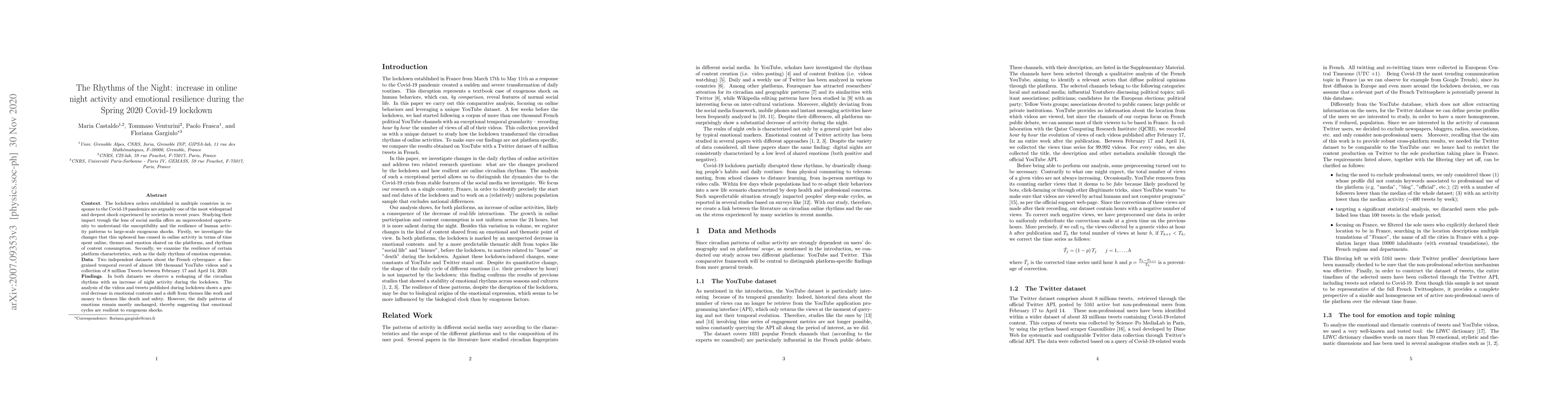 Context. The lockdown orders established in multiple countries in response to the Covid-19 pandemics are arguably one of the most widespread and deepest shock experienced by societies in recent years. Studying their impact trough the lens of social media offers an unprecedented opportunity to understand the susceptibility and the resilience of human activity patterns to large-scale exogenous shocks. Firstly, we investigate the changes that this upheaval has caused in online activity in terms of time spent online, themes and emotion shared on the platforms, and rhythms of content consumption. Secondly, we examine the resilience of certain platform characteristics, such as the daily rhythms of emotion expression. Data. Two independent datasets about the French cyberspace: a fine-grained temporal record of almost 100 thousand YouTube videos and a collection of 8 million Tweets between February 17 and April 14, 2020. Findings. In both datasets we observe a reshaping of the circadian rhythms with an increase of night activity during the lockdown. The analysis of the videos and tweets published during lockdown shows a general decrease in emotional contents and a shift from themes like work and money to themes like death and safety. However, the daily patterns of emotions remain mostly unchanged, thereby suggesting that emotional cycles are resilient to exogenous shocks.