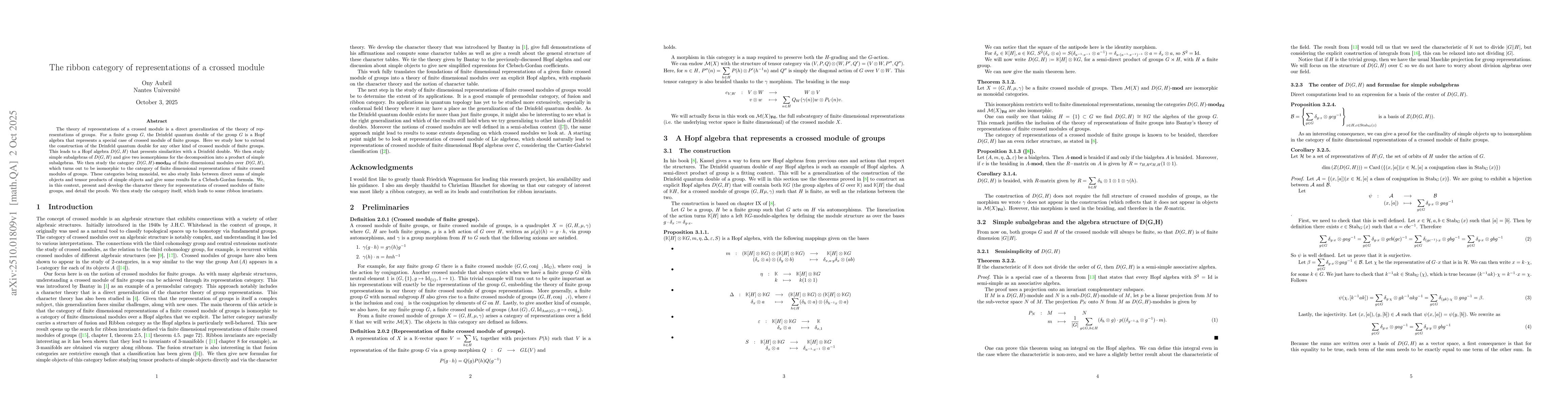 The technical contribution lies in the construction of a ribbon category from finite crossed modules, along with the derivation of explicit fusion rules and quantum invariants through the interplay of character theory and Hopf algebra structures.