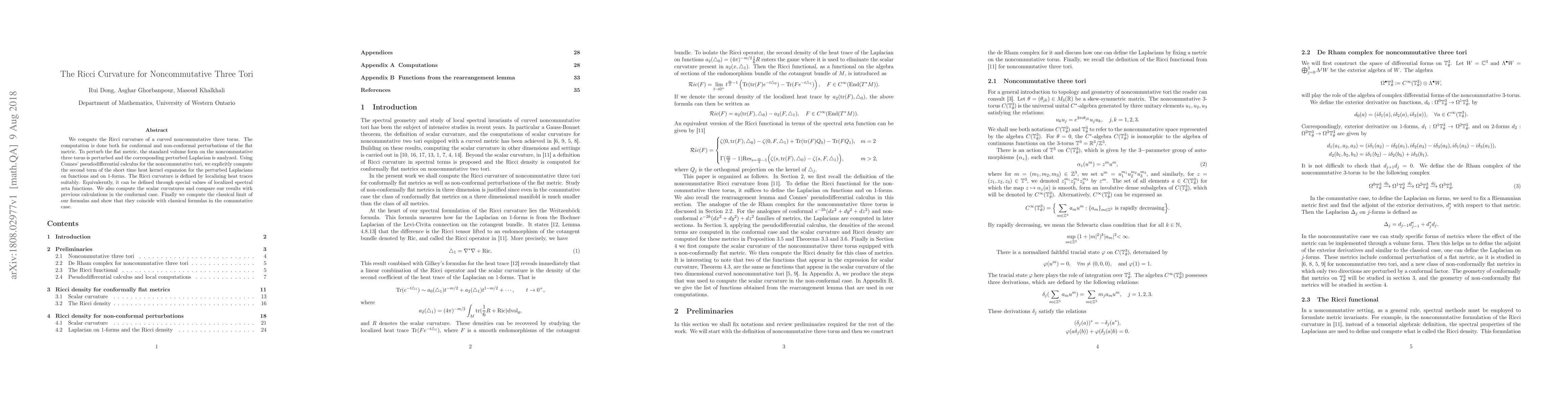 We compute the Ricci curvature of a curved noncommutative three torus. The computation is done both for conformal and non-conformal perturbations of the flat metric. To perturb the flat metric, the standard volume form on the noncommutative three torus is perturbed and the corresponding perturbed Laplacian is analyzed. Using Connes' pseudodifferential calculus for the noncommutative tori, we explicitly compute the second term of the short time heat kernel expansion for the perturbed Laplacians on functions and on 1-forms. The Ricci curvature is defined by localizing heat traces suitably. Equivalerntly, it can be defined through special values of localized spectral zeta functions. We also compute the scalar curvatures and compare our results with previous calculations in the conformal case. Finally we compute the classical limit of our formulas and show that they coincide with classical formulas in the commutative case.