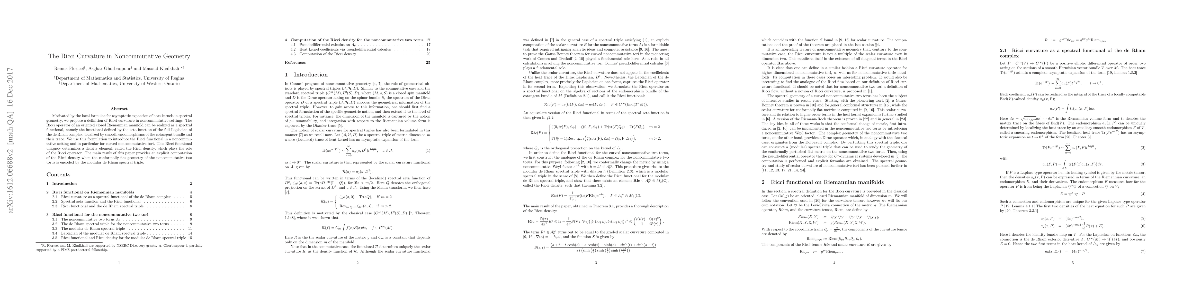 Motivated by the local formulae for asymptotic expansion of heat kernels in spectral geometry, we propose a definition of Ricci curvature in noncommutative settings. The Ricci operator of an oriented closed Riemannian manifold can be realized as a spectral functional, namely the functional defined by the zeta function of the full Laplacian of the de Rham complex, localized by smooth endomorphisms of the cotangent bundle and their trace. We use this formulation to introduce the Ricci functional in a noncommutative setting and in particular for curved noncommutative tori. This Ricci functional uniquely determines a density element, called the Ricci density, which plays the role of the Ricci operator. The main result of this paper provides an explicit computation of the Ricci density when the conformally flat geometry of the noncommutative two torus is encoded by the modular de Rham spectral triple.
