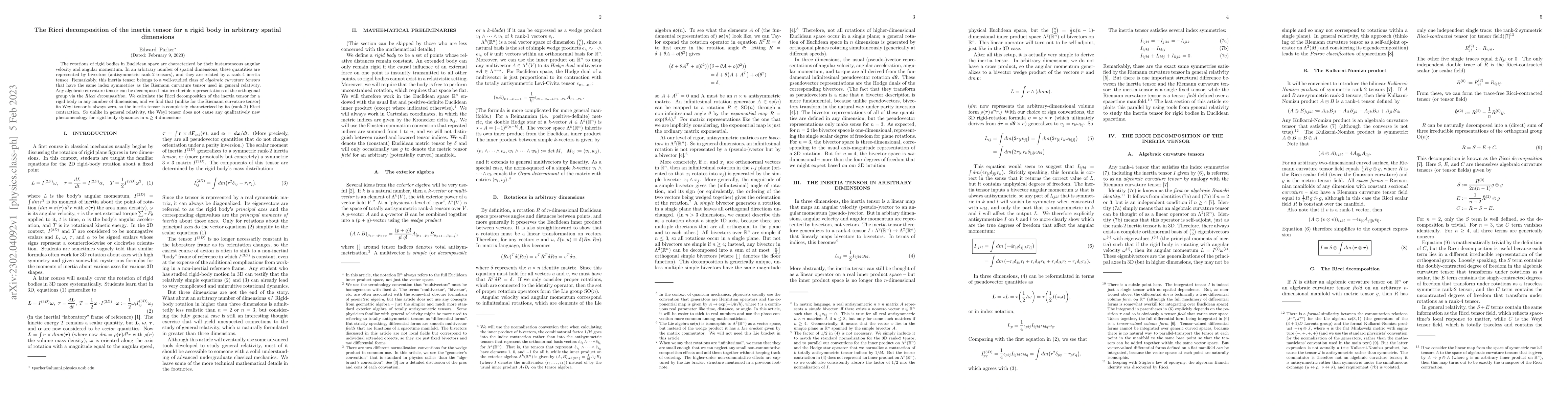 The rotations of rigid bodies in Euclidean space are characterized by their instantaneous angular velocity and angular momentum. In an arbitrary number of spatial dimensions, these quantities are represented by bivectors (antisymmetric rank-2 tensors), and they are related by a rank-4 inertia tensor. Remarkably, this inertia tensor belongs to a well-studied class of algebraic curvature tensors that have the same index symmetries as the Riemann curvature tensor used in general relativity. Any algebraic curvature tensor can be decomposed into irreducible representations of the orthogonal group via the Ricci decomposition. We calculate the Ricci decomposition of the inertia tensor for a rigid body in any number of dimensions, and we find that (unlike for the Riemann curvature tensor) its Weyl tensor is always zero, so the inertia tensor is completely characterized by its (rank-2) Ricci contraction. So unlike in general relativity, the Weyl tensor does not cause any qualitatively new phenomenology for rigid-body dynamics in $n \geq 4$ dimensions.