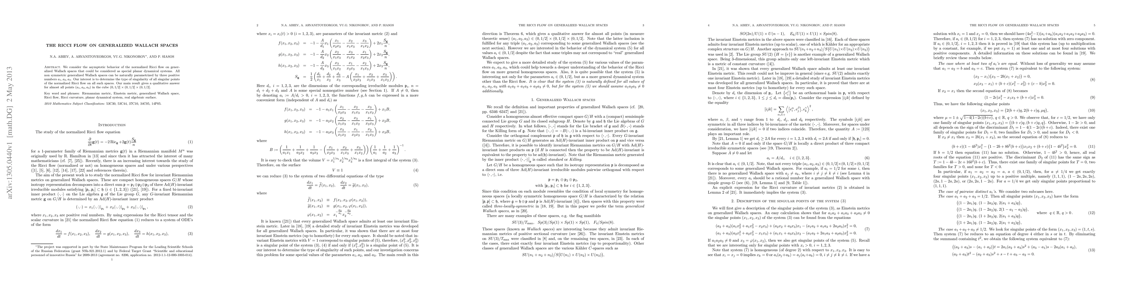 We consider the asymptotic behavior of the normalized Ricci flow on generalized Wallach spaces that could be considered as special planar dynamical systems. All non symmetric generalized Wallach spaces can be naturally parametrized by three positive numbers $a_1, a_2, a_3$. Our interest is to determine the type of singularity of all singular points of the normalized Ricci flow on all such spaces. Our main result gives a qualitative answer for almost all points $(a_1,a_2,a_3)$ in the cube $(0,1/2]\times (0,1/2]\times (0,1/2]$.