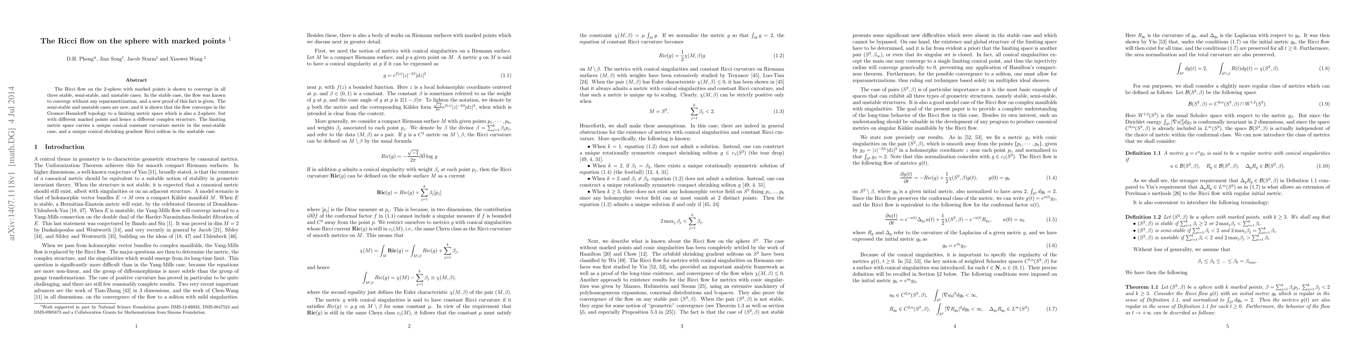 The Ricci flow on a 2-sphere with marked points converges to different limit spaces in stable, semi-stable, and unstable cases, resulting in a 2-sphere with distinct complex structures.