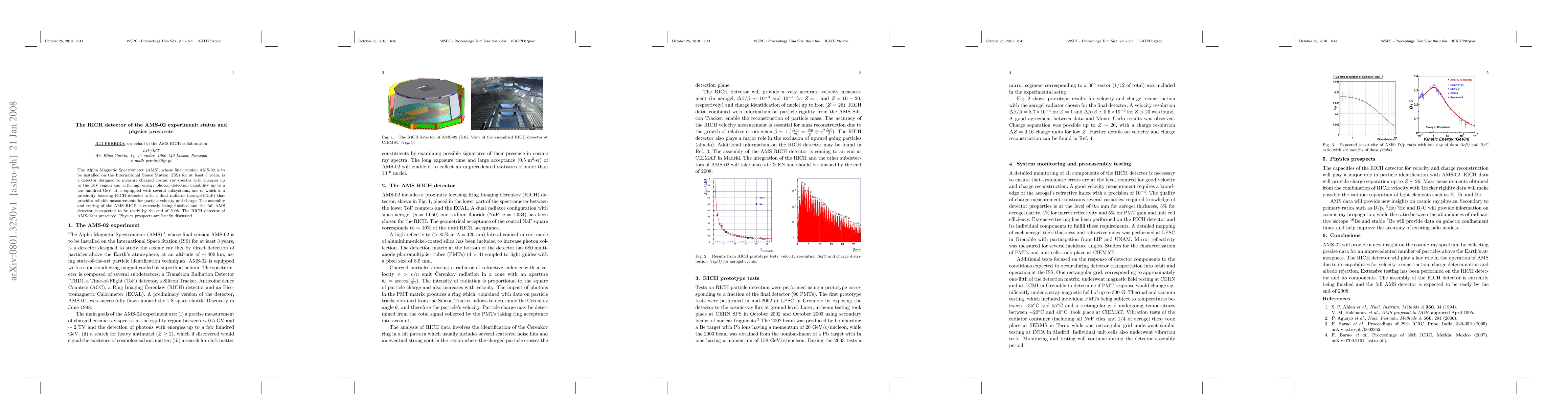 The AMS-02 detector, set to be installed on the ISS, includes a RICH detector for precise cosmic ray and high-energy photon measurements. The RICH detector, utilizing dual radiators, is nearing completion and is expected to provide reliable particle velocity and charge data.