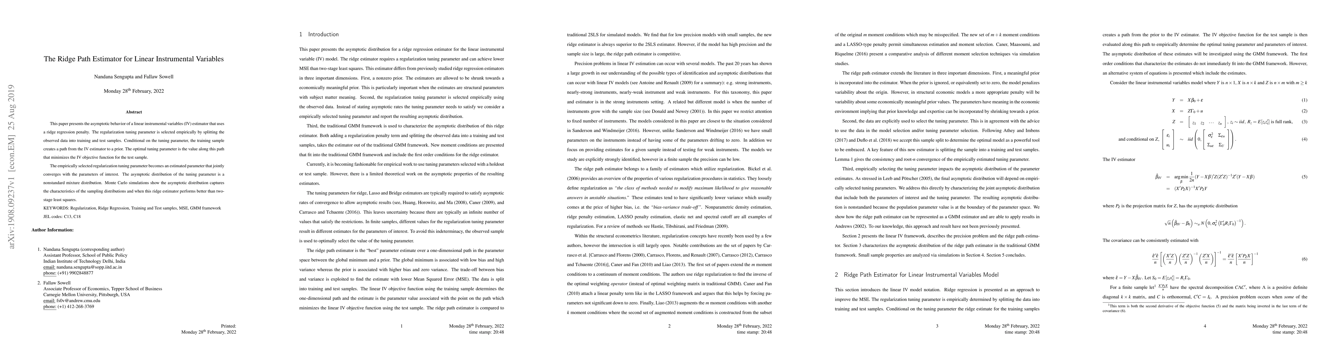 This paper presents the asymptotic behavior of a linear instrumental variables (IV) estimator that uses a ridge regression penalty. The regularization tuning parameter is selected empirically by splitting the observed data into training and test samples. Conditional on the tuning parameter, the training sample creates a path from the IV estimator to a prior. The optimal tuning parameter is the value along this path that minimizes the IV objective function for the test sample. The empirically selected regularization tuning parameter becomes an estimated parameter that jointly converges with the parameters of interest. The asymptotic distribution of the tuning parameter is a nonstandard mixture distribution. Monte Carlo simulations show the asymptotic distribution captures the characteristics of the sampling distributions and when this ridge estimator performs better than two-stage least squares.