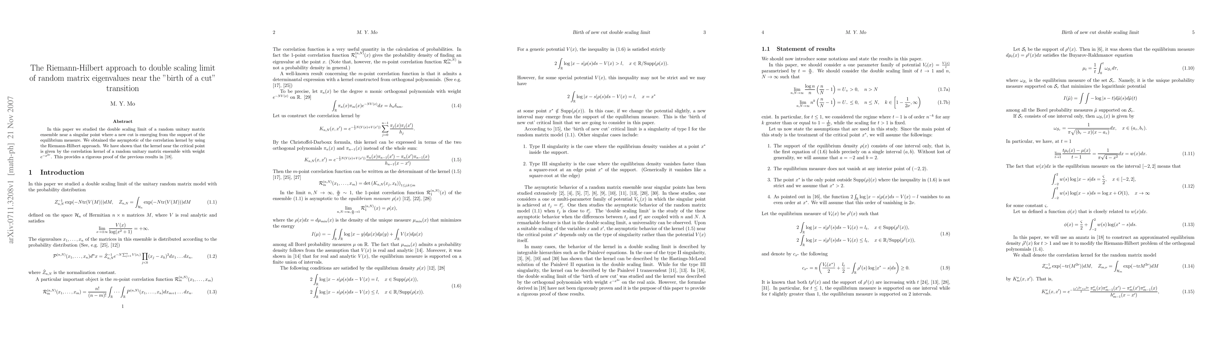 This paper utilizes the Riemann-Hilbert approach to study the double scaling limit of random unitary matrix ensembles near the "birth of a cut," deriving the asymptotic correlation kernel. It confirms Eynard's previous findings by showing the kernel resembles that of a random unitary matrix ensemble with a modified weight $e^{-x^{2\nu}}$.