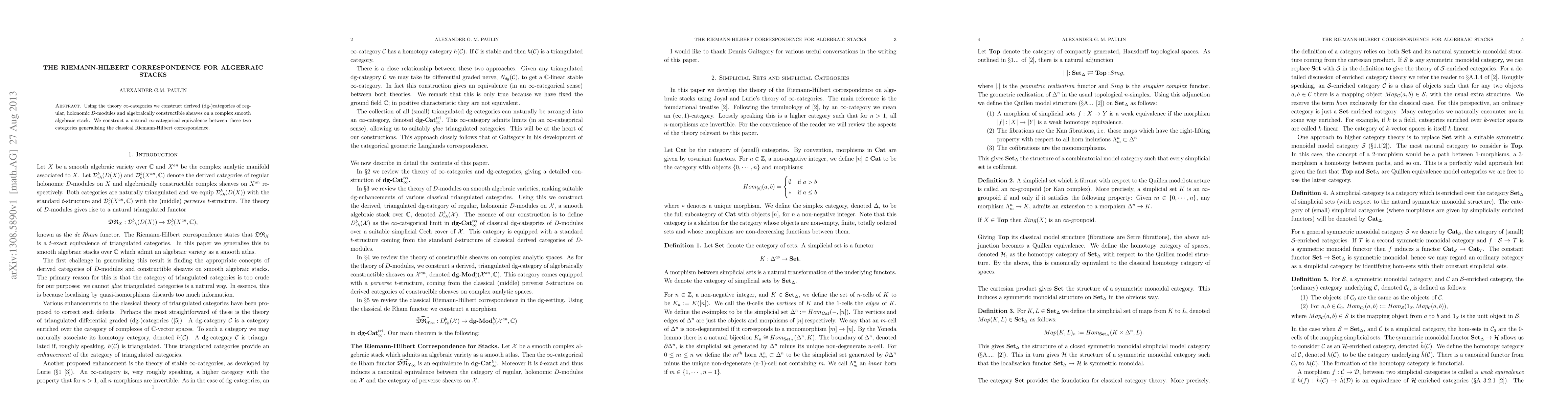 Using the theory infinity-categories we construct derived (dg-)categories of regular, holonomic D-modules and algebraically constructible sheaves on a complex smooth algebraic stack. We construct a natural infinity-categorical equivalence between these two categories generalising the classical Riemann-Hilbert correspondence.