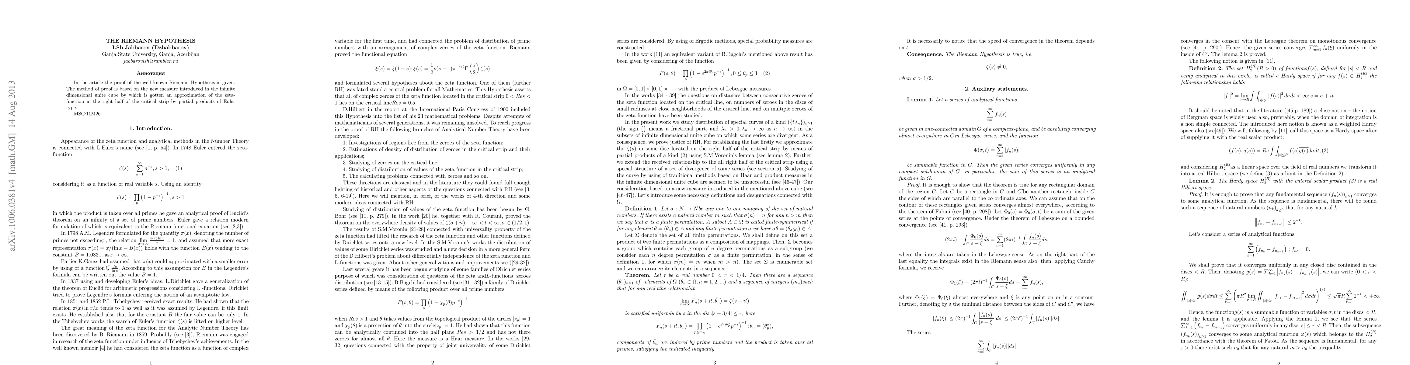 In the paper the well known Riemann Hypothesis is proven. The proof is based on uniform approximation of the zeta function discs of the critical strip placed to the right from the critical line.The basic moment is a use of a new mesure introduced in the infinite dimensional unite cube different from the Haar or product measures