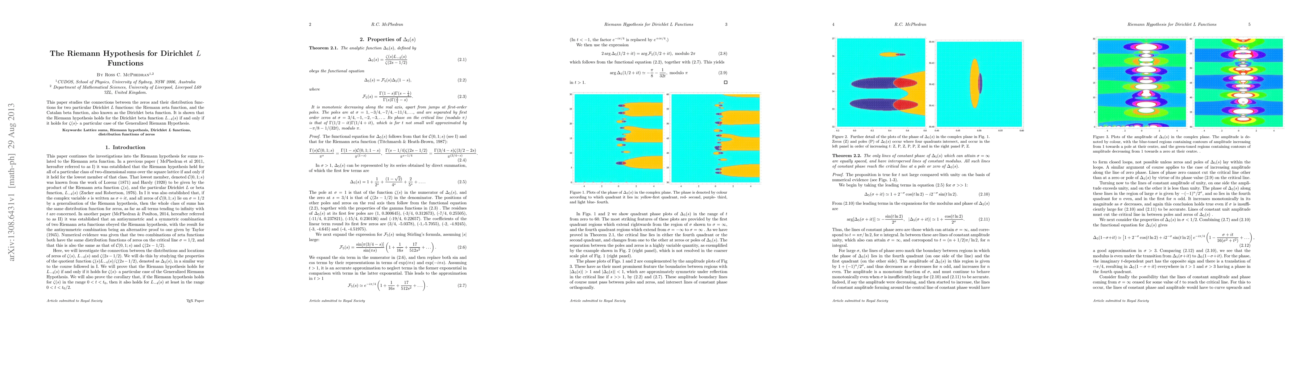 This paper studies the connections between the zeros and their distribution functions for two particular Dirichlet $L$ functions: the Riemann zeta function, and the Catalan beta function, also known as the Dirichlet beta function. It is shown that the Riemann hypothesis holds for the Dirichlet beta function $L_{-4}(s)$ if and only if it holds for $\zeta (s)$- a particular case of the Generalized Riemann Hypothesis.