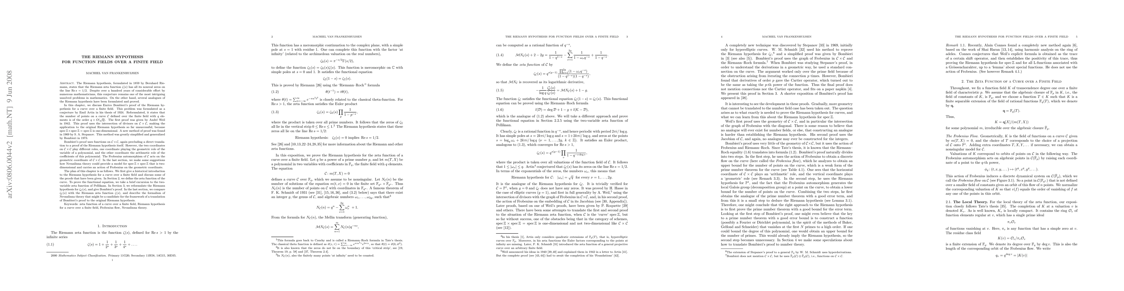 Bombieri's proof simplifies and generalizes the Riemann hypothesis for curves over finite fields, establishing that the number of points on such a curve is $q+O(\sqrt{q})$. This differs from the original Riemann hypothesis due to the dimensional nature of the methods used.