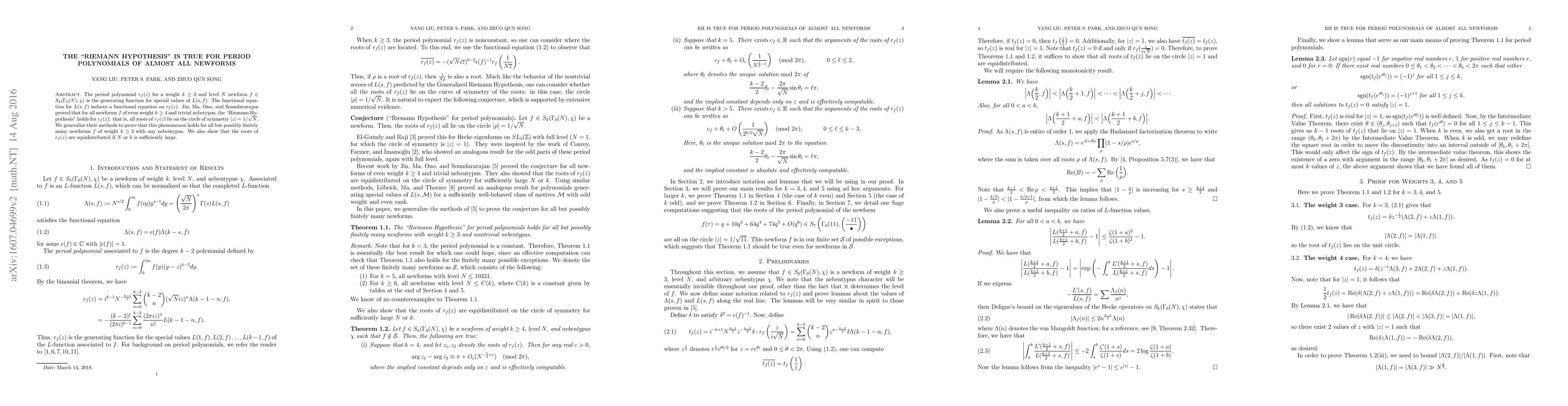 The period polynomial $r_f(z)$ for a weight $k \geq 3$ newform $f \in S_k(\Gamma_0(N),\chi)$ is the generating function for special values of $L(s,f)$. The functional equation for $L(s, f)$ induces a functional equation on $r_f(z)$. Jin, Ma, Ono, and Soundararajan proved that for all newforms $f$ of even weight $k \ge 4$ and trivial nebetypus, the "Riemann Hypothesis" holds for $r_f(z)$: that is, all roots of $r_f(z)$ lie on the circle of symmetry $|z| =1/\sqrt{N}$. We generalize their methods to prove that this phenomenon holds for all but possibly finitely many newforms $f$ of weight $k \ge 3$ with any nebentypus. We also show that the roots of $r_f(z)$ are equidistributed if $N$ or $k$ is sufficiently large.