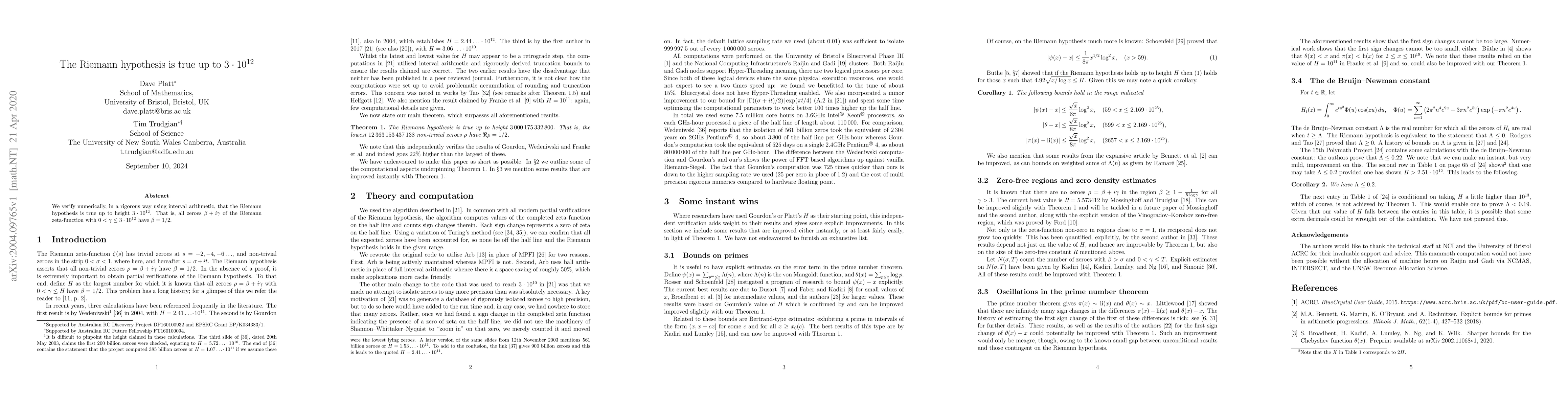 We verify numerically, in a rigorous way using interval arithmetic, that the Riemann hypothesis is true up to height $3\cdot10^{12}$. That is, all zeroes $\beta + i\gamma$ of the Riemann zeta-function with $0<\gamma\leq 3\cdot 10^{12}$ have $\beta = 1/2$.