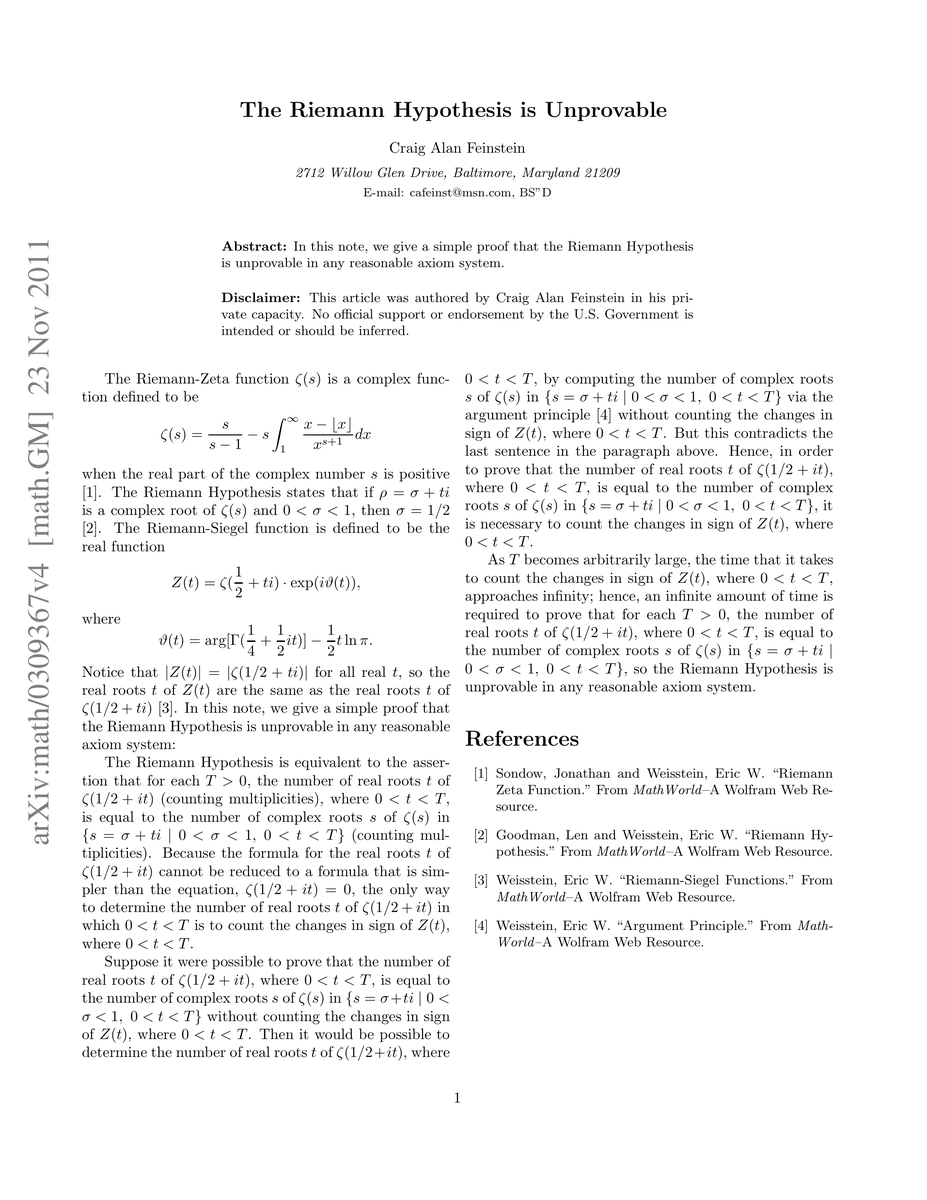 The paper provides a simple proof demonstrating the unprovability of the Riemann Hypothesis within any reasonable axiom system.