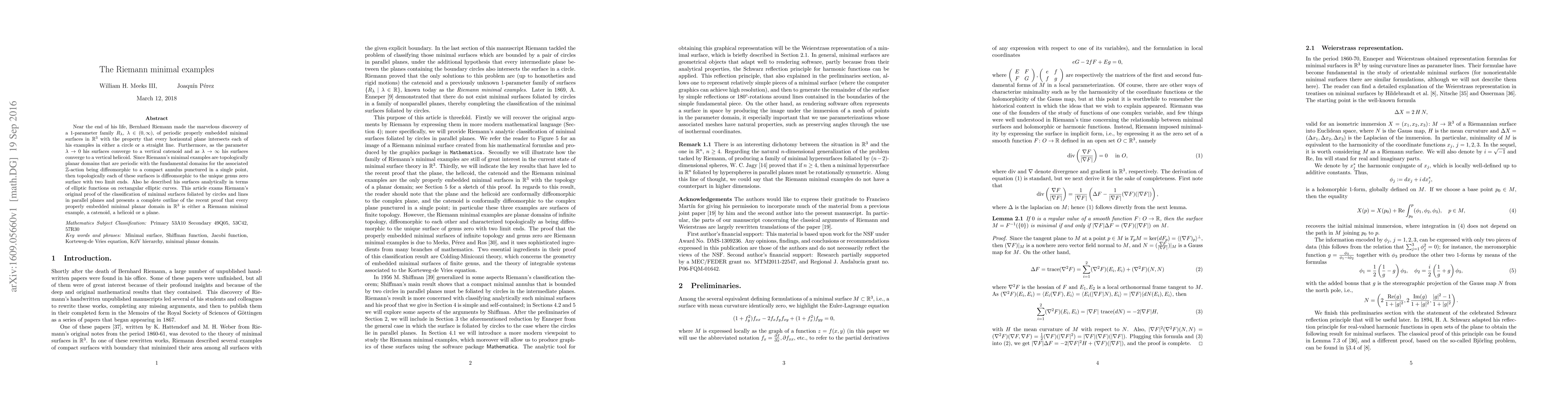 Near the end of his life, Bernhard Riemann made the marvelous discovery of a 1-parameter family $R_{\lambda}$, $\lambda\in (0,\infty)$, of periodic properly embedded minimal surfaces in $\mathbb{R}^3$ with the property that every horizontal plane intersects each of his examples in either a circle or a straight line. Furthermore, as the parameter $\lambda\to 0$ his surfaces converge to a vertical catenoid and as $\lambda\to \infty$ his surfaces converge to a vertical helicoid. Since Riemann's minimal examples are topologically planar domains that are periodic with the fundamental domains for the associated $\mathbb{Z}$-action being diffeomorphic to a compact annulus punctured in a single point, then topologically each of these surfaces is diffeomorphic to the unique genus zero surface with two limit ends. Also he described his surfaces analytically in terms of elliptic functions on rectangular elliptic curves. This article exams Riemann's original proof of the classification of minimal surfaces foliated by circles and lines in parallel planes and presents a complete outline of the recent proof that every properly embedded minimal planar domain in $\mathbb{R}^3$ is either a Riemann minimal example, a catenoid, a helicoid or a plane.
