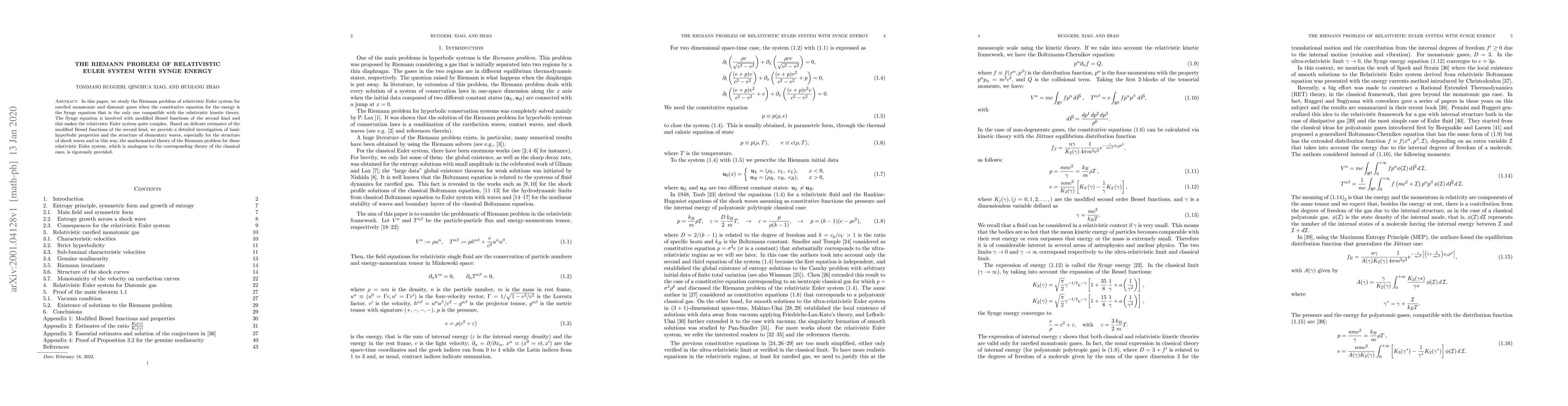 This paper investigates the Riemann problem for the relativistic Euler system with Synge energy, focusing on rarefied monatomic and diatomic gases. It provides a detailed analysis of the hyperbolic properties and elementary wave structures, particularly shock waves, using estimates of modified Bessel functions to rigorously establish the mathematical theory.