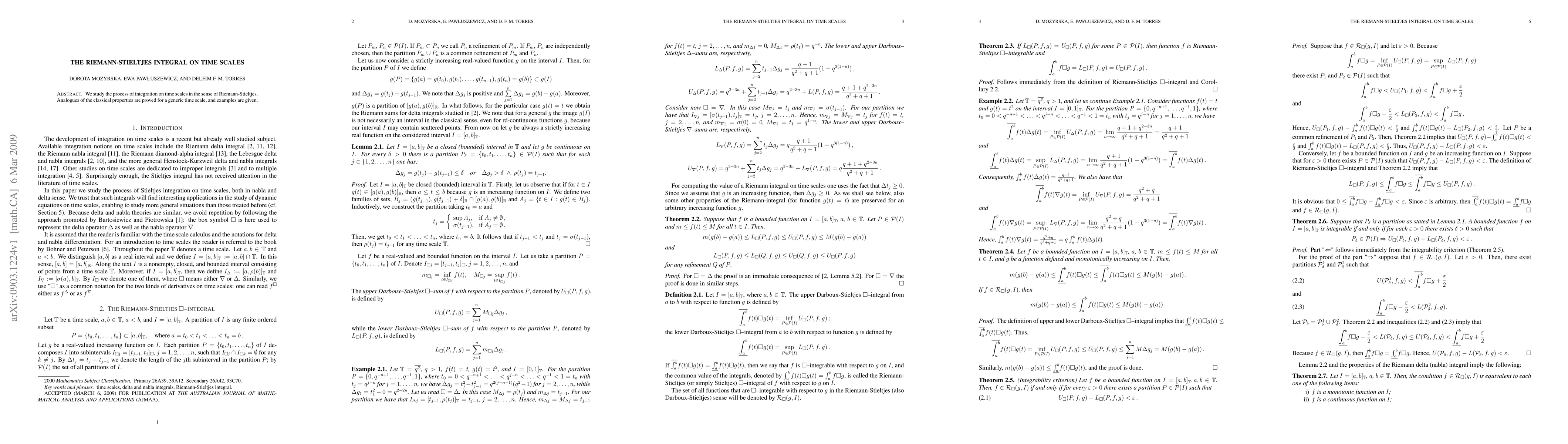 We study the process of integration on time scales in the sense of Riemann-Stieltjes. Analogues of the classical properties are proved for a generic time scale, and examples are given.