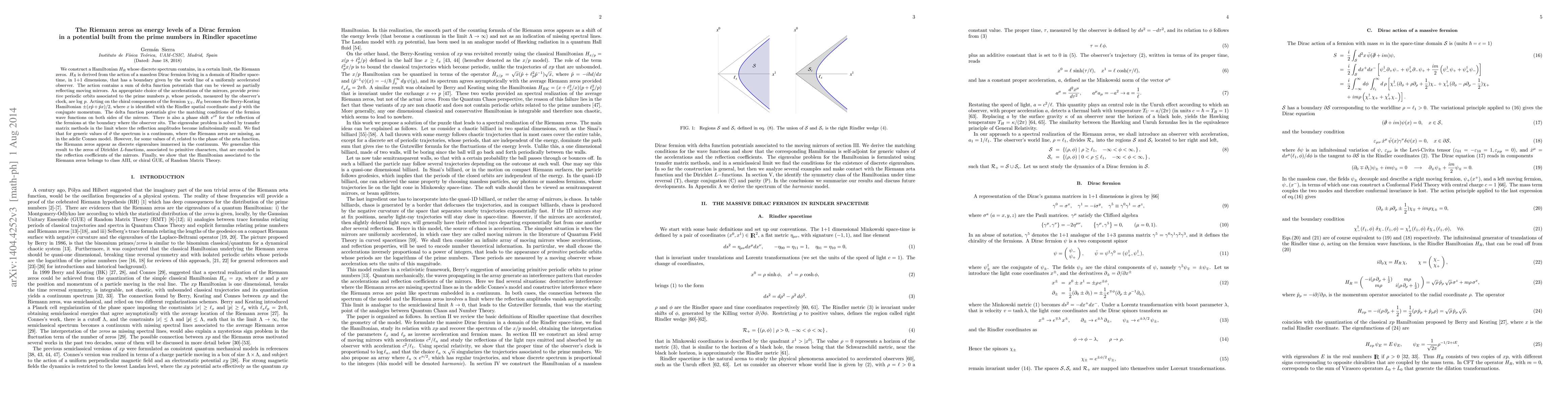 We construct a Hamiltonian H whose discrete spectrum contains, in a certain limit, the Riemann zeros. H is derived from the action of a massless Dirac fermion living in a domain of Rindler spacetime, in 1+1 dimensions, that has a boundary given by the world line of a uniformly accelerated observer. The action contains a sum of delta function potentials that can be viewed as partially reflecting moving mirrors. An appropriate choice of the accelerations of the mirrors, provide primitive periodic orbits associated to the prime numbers $p$, whose periods, measured by the observer's clock, are log p. Acting on the chiral components of the fermion, H becomes the Berry-Keating Hamiltonian (x p + p x)/2, where x is identified with the Rindler spatial coordinate and p with the conjugate momentum. The delta function potentials give the matching conditions of the fermion wave functions on both sides of the mirrors. There is also a phase shift for the reflection of the fermions at the boundary where the observer sits. The eigenvalue problem is solved by transfer matrix methods in the limit where the reflection amplitudes become infinitesimally small. We find that for generic values of the phase shift the spectrum is a continuum, where the Riemann zeros are missing, as in the adelic Connes model. However, for some values of phase shift, related to the phase of the zeta function, the Riemann zeros appear as discrete eigenvalues immersed in the continuum. We generalize this result to the zeros of Dirichlet L-functions, associated to primitive characters, that are encoded in the reflection coefficients of the mirrors. Finally, we show that the Hamiltonian associated to the Riemann zeros belongs to class AIII, or chiral GUE, of Random Matrix Theory.
