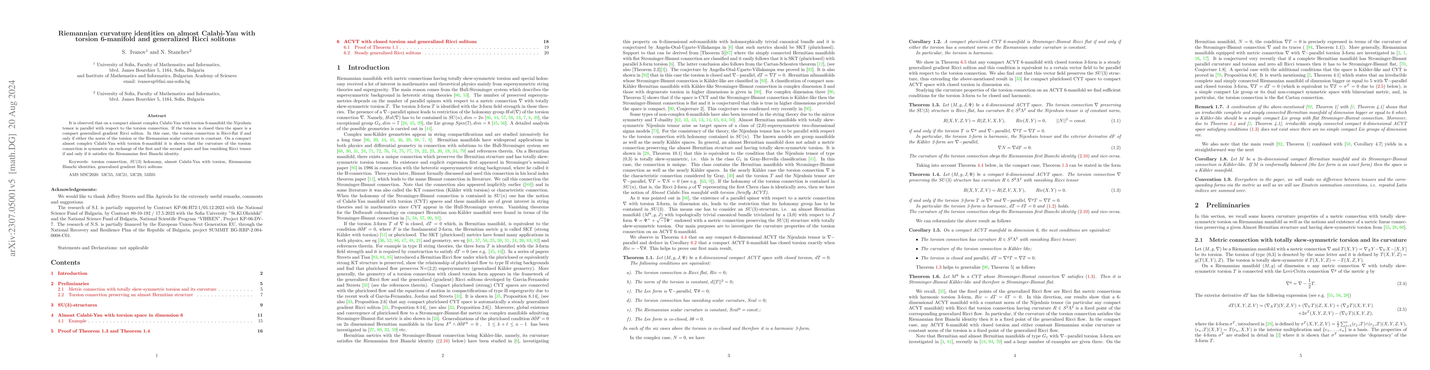 Curvature properties of the torsion connection on an Almost complex CYT 6-manifold are investigated. It is observed that on a compact ACYT 6-manifold the Nijenhuis tensor is parallel with respect to the torsion connection. It is shown that a compact ACYT 6-manifold has closed torsion if and only if the Ricci tensor of the torsion connection is equal to the covariant derivative of the Lee form with respect to the torsion connection. It is proved that a compact ACYT 6-manifold with closed torsion is Ricci flat if and only if either the norm of the torsion is constant or the Riemannian scalar curvature is constant. It is observed that any compact ACYT 6-manifold with closed torsion 3-form is a generalized gradient Ricci soliton and this is equivalent to a certain vector field to be parallel with respect to the torsion connection. In particular, this vector field is an infinitesimal authomorphism of the $SU(3)$ structure. It is also proved that on a compact ACYT 6-manifold the curvature of the torsion connection $R\in S^2\Lambda^2$ and has vanishing Ricci tensor if and only if the three-form torsion is parallel with respect to the Levi-Civita and to the torsion connection simultaneously. In particular, the conditions $R\in S^2\Lambda^2, Ric=0$ are equivalent to the condition that the curvature of the torsion connection satisfies the Riemannian first Bianchi identity, i.e. it is K\"ahler-like. In this case the torsion 3-form is closed and co-closed. In the complex case, it follows that the curvature of the Strominger-Bismut connection on a six dimensional CYT space satisfies the conditions $R\in S^2\Lambda^2, Ric=0$ if and only if it is K\"ahler-like, therefore flat, and has parallel torsion with respect to both the Levi-Civita and Strominger-Bismut connections.