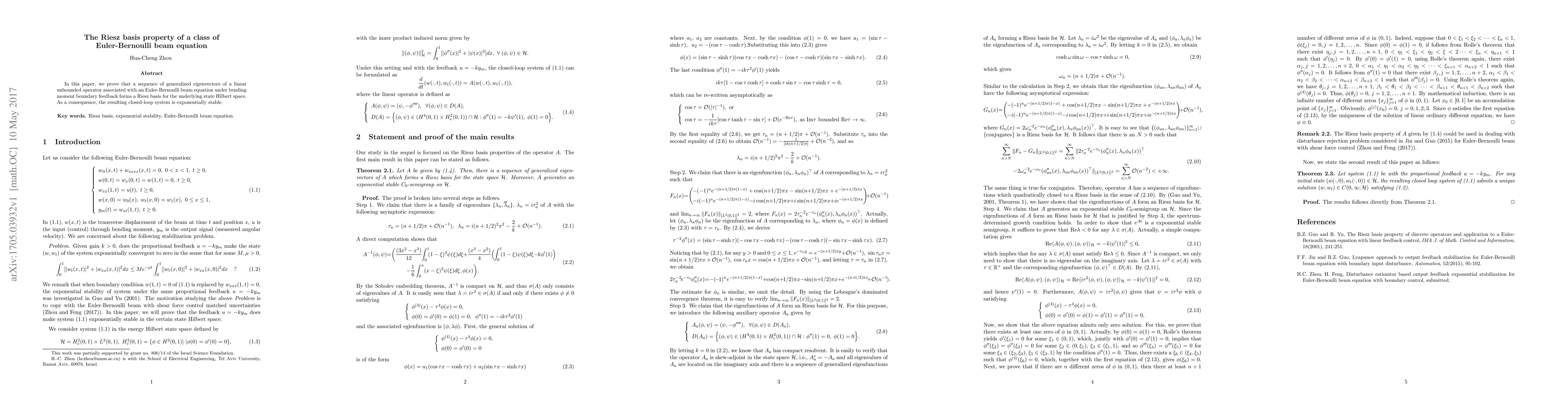 This paper demonstrates that a sequence of generalized eigenvectors for a linear operator related to an Euler-Bernoulli beam equation, under bending moment boundary feedback, forms a Riesz basis, ensuring exponential stability of the closed-loop system.