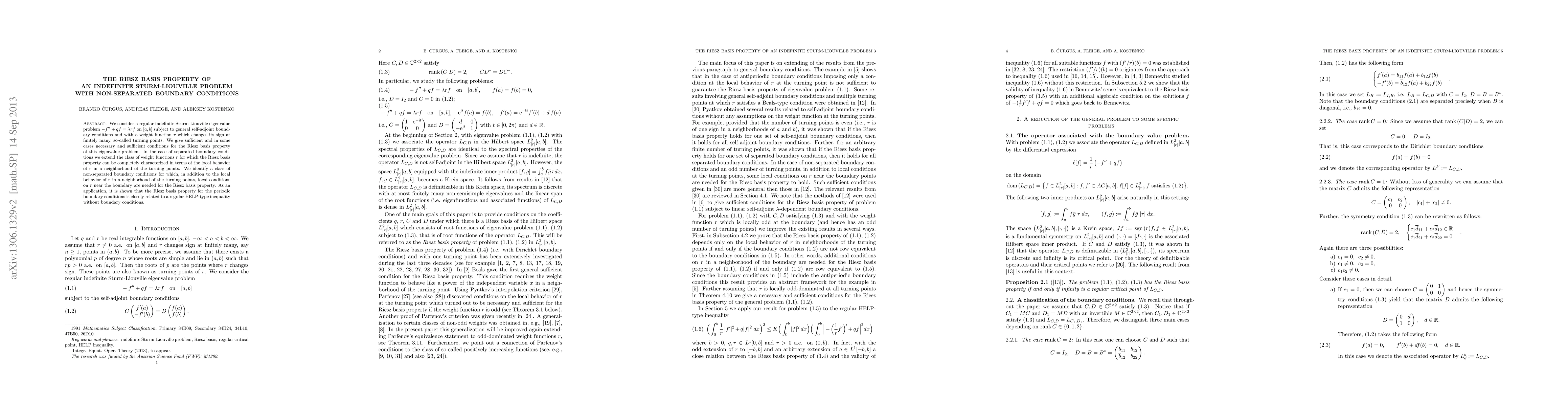 We consider a regular indefinite Sturm-Liouville eigenvalue problem \{$-f" + q f = \lambda r f$} on $[a,b]$ subject to general self-adjoint boundary conditions and with a weight function $r$ which changes its sign at finitely many, so-called turning points. We give sufficient and in some cases necessary and sufficient conditions for the Riesz basis property of this eigenvalue problem. In the case of separated boundary conditions we extend the class of weight functions $r$ for which the Riesz basis property can be completely characterized in terms of the local behavior of $r$ in a neighborhood of the turning points. We identify a class of non-separated boundary conditions for which, in addition to the local behavior of $r$ in a neighborhood of the turning points, local conditions on $r$ near the boundary are needed for the Riesz basis property. As an application, it is shown that the Riesz basis property for the periodic boundary conditions is closely related to a regular HELP-type inequality without boundary conditions.