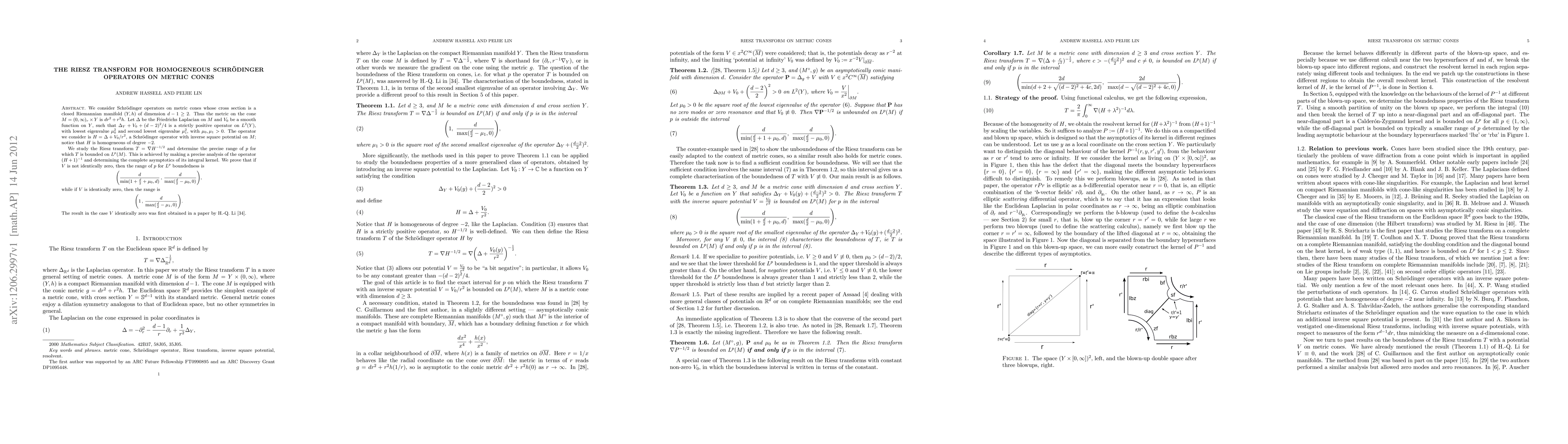 We consider Schroedinger operators on metric cones whose cross section is a closed Riemannian manifold $(Y, h)$ of dimension $d-1 \geq 2$. Thus the metric on the cone $M = (0, \infty)_r \times Y$ is $dr^2 + r^2 h$. Let $\Delta$ be the Friedrichs Laplacian on $M$ and $V_0$ be a smooth function on $Y$, such that $\Delta_Y + V_0 + (d-2)^2/4$ is a strictly positive operator on $L^2(Y)$, with lowest eigenvalue $\mu^2_0 $ and second lowest eigenvalue $\mu^2_1$, with $\mu_0, \mu_1 > 0$. The operator we consider is $H = \Delta + V_0/r^2$, a Schr\"odinger operator with inverse square potential on $M$; notice that $H$ is homogeneous of degree -2. We study the Riesz transform $T = \nabla H^{-1/2}$ and determine the precise range of $p$ for which $T$ is bounded on $L^p(M)$. This is achieved by making a precise analysis of the operator $(H + 1)^{-1}$ and determining the complete asymptotics of its integral kernel. We prove that if $V$ is not identically zero, then the range of $p$ for $L^p$ boundedness is $$ d/ \Big(min(1+d/2+\mu_0, d \Big) < p < d / \Big(max(d/2-\mu_0, 0) \Big),$$ while if $V$ is identically zero, then the range is $$ 1 < p < d / \Big(max(d/2-\mu_1, 0 \Big).$$ The result in the case $V$ identically zero was first obtained in a paper by H.-Q. Li.