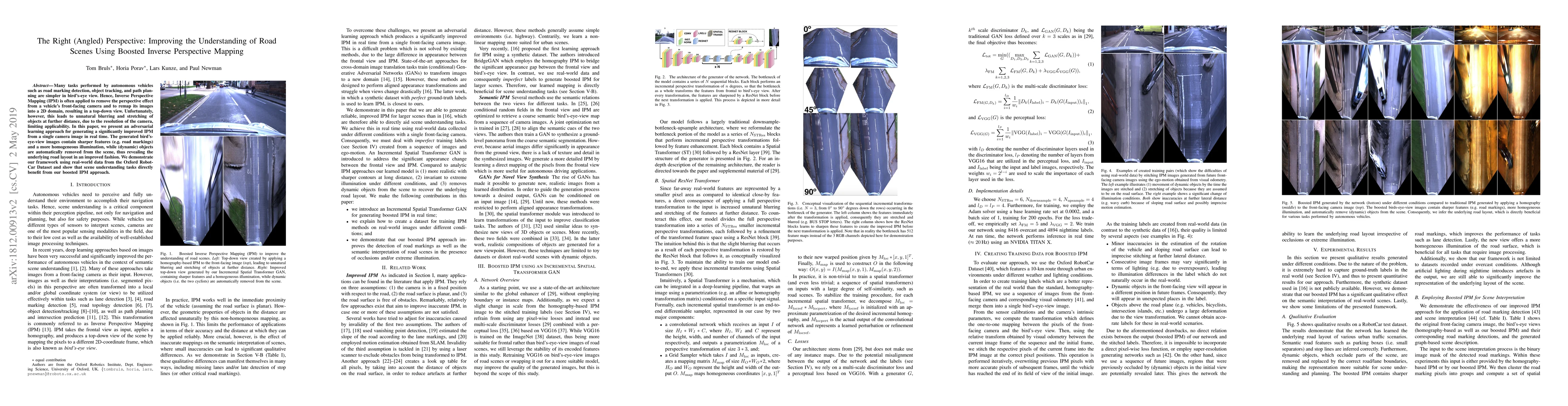 Many tasks performed by autonomous vehicles such as road marking detection, object tracking, and path planning are simpler in bird's-eye view. Hence, Inverse Perspective Mapping (IPM) is often applied to remove the perspective effect from a vehicle's front-facing camera and to remap its images into a 2D domain, resulting in a top-down view. Unfortunately, however, this leads to unnatural blurring and stretching of objects at further distance, due to the resolution of the camera, limiting applicability. In this paper, we present an adversarial learning approach for generating a significantly improved IPM from a single camera image in real time. The generated bird's-eye-view images contain sharper features (e.g. road markings) and a more homogeneous illumination, while (dynamic) objects are automatically removed from the scene, thus revealing the underlying road layout in an improved fashion. We demonstrate our framework using real-world data from the Oxford RobotCar Dataset and show that scene understanding tasks directly benefit from our boosted IPM approach.