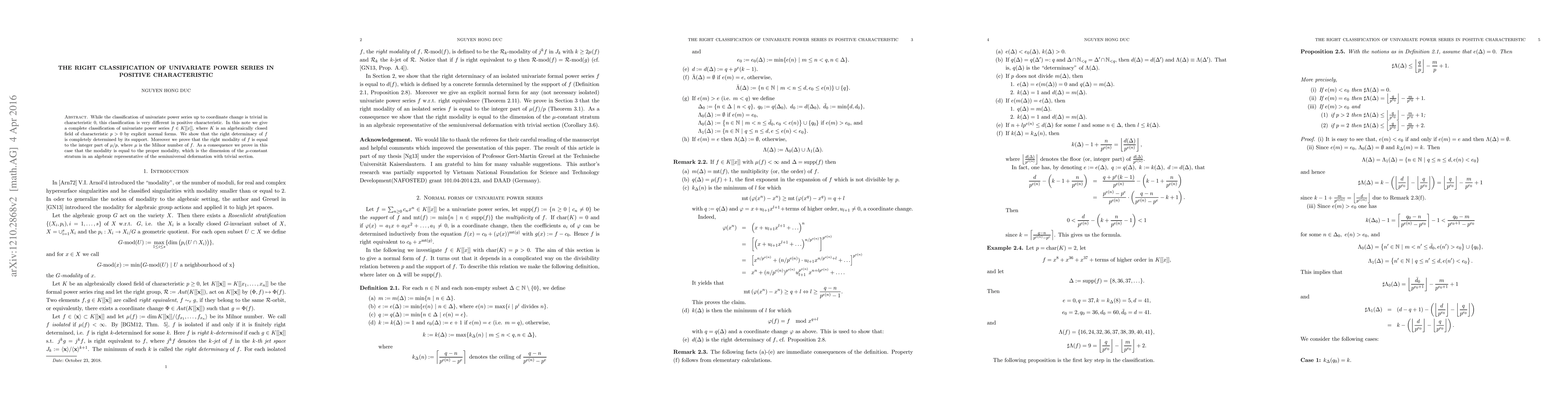 This paper provides a complete classification of univariate power series in positive characteristic fields, presenting explicit normal forms. It shows that the right determinacy and modality of the series are determined by their support and the integer part of the Milnor number divided by the characteristic, respectively.