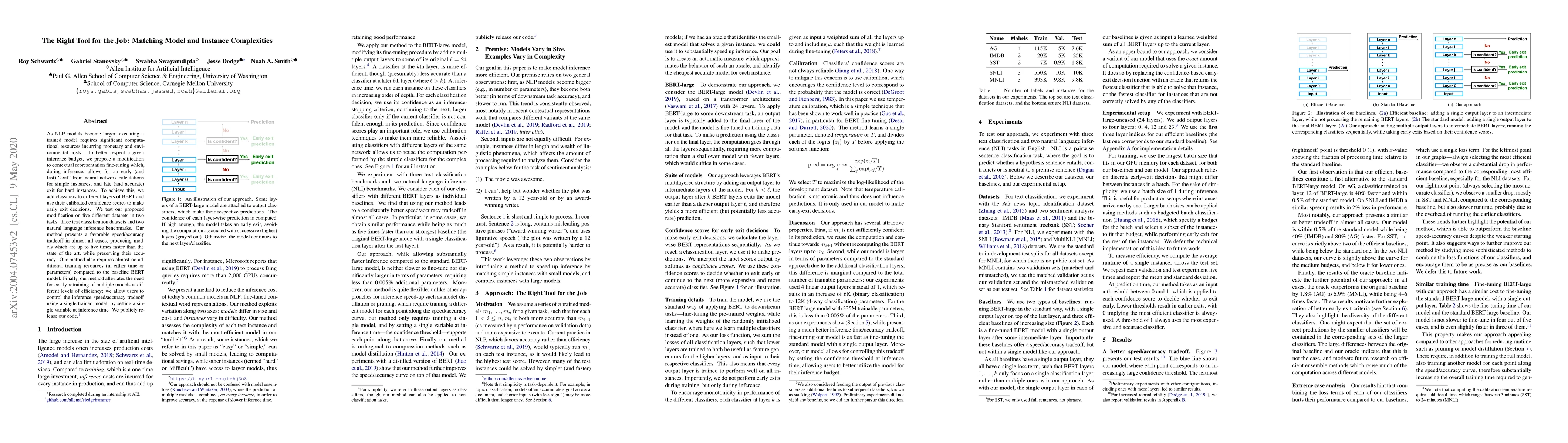 As NLP models become larger, executing a trained model requires significant computational resources incurring monetary and environmental costs. To better respect a given inference budget, we propose a modification to contextual representation fine-tuning which, during inference, allows for an early (and fast) "exit" from neural network calculations for simple instances, and late (and accurate) exit for hard instances. To achieve this, we add classifiers to different layers of BERT and use their calibrated confidence scores to make early exit decisions. We test our proposed modification on five different datasets in two tasks: three text classification datasets and two natural language inference benchmarks. Our method presents a favorable speed/accuracy tradeoff in almost all cases, producing models which are up to five times faster than the state of the art, while preserving their accuracy. Our method also requires almost no additional training resources (in either time or parameters) compared to the baseline BERT model. Finally, our method alleviates the need for costly retraining of multiple models at different levels of efficiency; we allow users to control the inference speed/accuracy tradeoff using a single trained model, by setting a single variable at inference time. We publicly release our code.