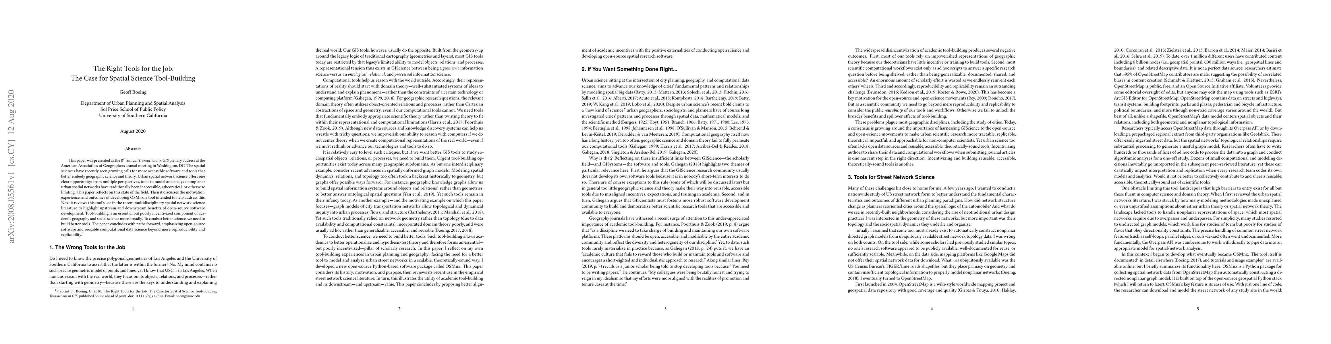 This paper discusses the need for accessible and theoretical spatial science tools, particularly in urban spatial network science, and presents the development of OSMnx to address these gaps. It highlights the benefits of open-source software in advancing multidisciplinary spatial network research and calls for more incentivized tool-building in academic geography and social science.