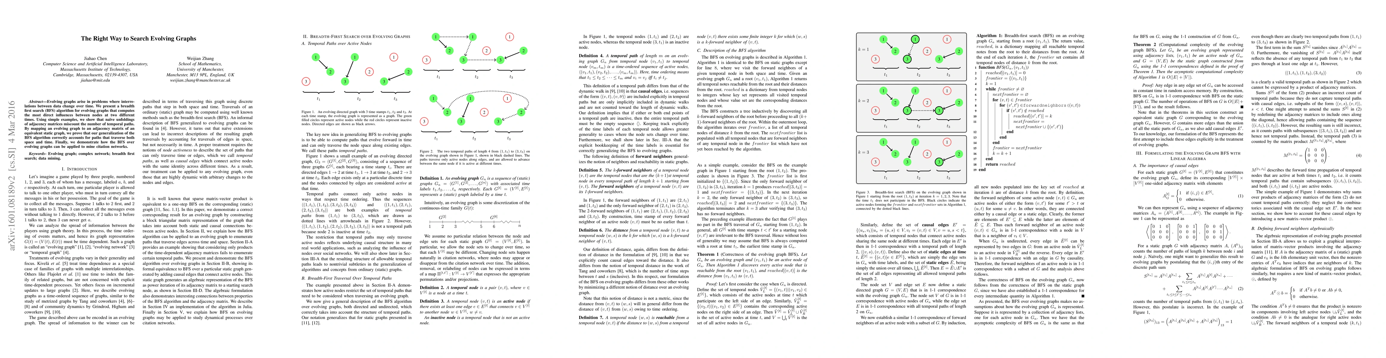 Evolving graphs arise in problems where interrelations between data change over time. We present a breadth first search (BFS) algorithm for evolving graphs that computes the most direct influences between nodes at two different times. Using simple examples, we show that naive unfoldings of adjacency matrices miscount the number of temporal paths. By mapping an evolving graph to an adjacency matrix of an equivalent static graph, we prove that our generalization of the BFS algorithm correctly accounts for paths that traverse both space and time. Finally, we demonstrate how the BFS over evolving graphs can be applied to mine citation networks.
