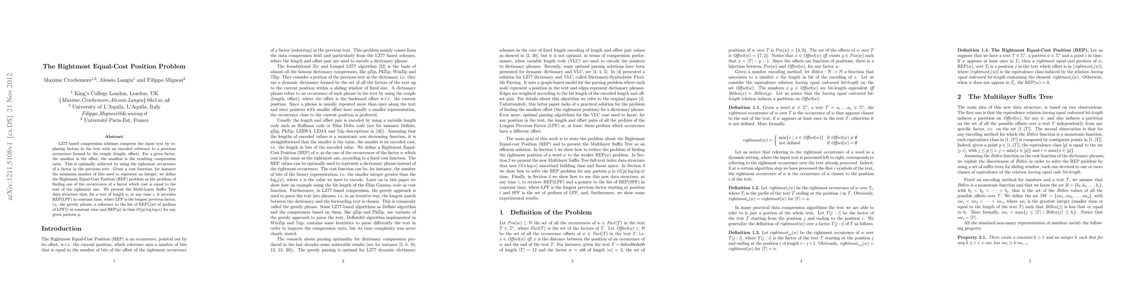 LZ77-based compression schemes compress the input text by replacing factors in the text with an encoded reference to a previous occurrence formed by the couple (length, offset). For a given factor, the smallest is the offset, the smallest is the resulting compression ratio. This is optimally achieved by using the rightmost occurrence of a factor in the previous text. Given a cost function, for instance the minimum number of bits used to represent an integer, we define the Rightmost Equal-Cost Position (REP) problem as the problem of finding one of the occurrences of a factor which cost is equal to the cost of the rightmost one. We present the Multi-Layer Suffix Tree data structure that, for a text of length n, at any time i, it provides REP(LPF) in constant time, where LPF is the longest previous factor, i.e. the greedy phrase, a reference to the list of REP({set of prefixes of LPF}) in constant time and REP(p) in time O(|p| log log n) for any given pattern p.